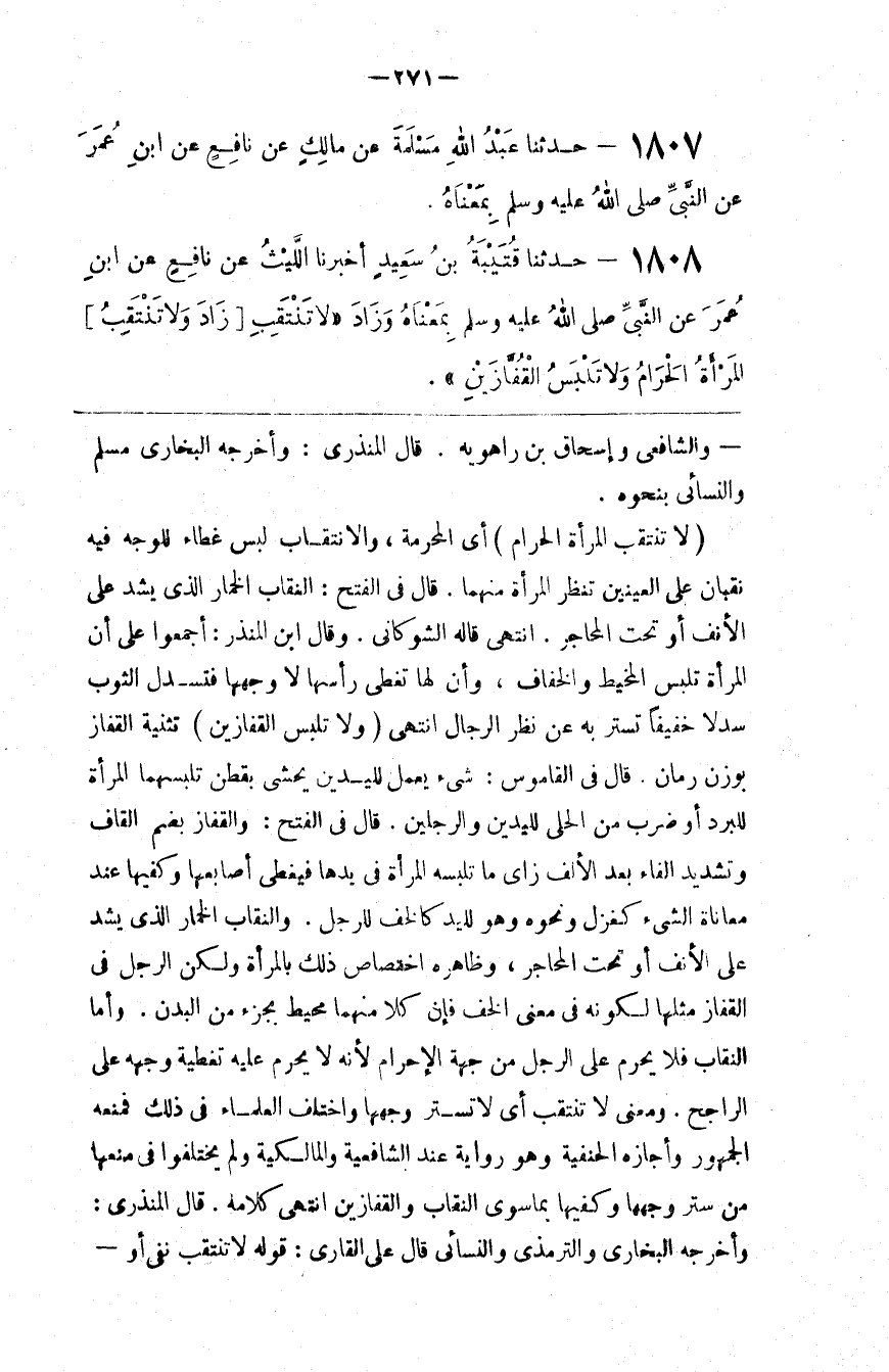 قَالَ الْمُنْذِرِيّ : وَأَخْرَجَهُ الْبُخَارِيّ وَالتِّرْمِذِيّ وَالنَّسَائِيُّ قَالَ عَلِيّ الْقَارِي : قَوْله لَا تَنْتَقِب نَفْي أَوْ @