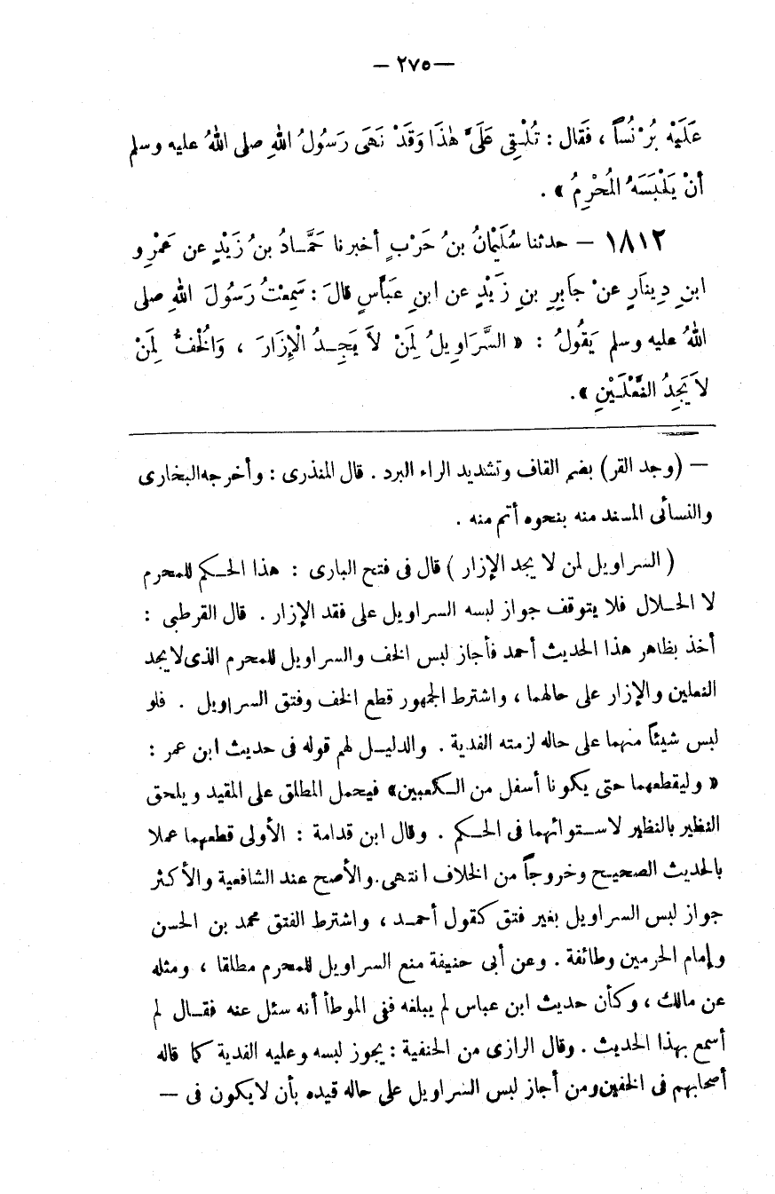 : قَالَ فِي فَتْح الْبَارِي : هَذَا الْحُكْم لِلْمُحْرِمِ لَا الْحَلَال فَلَا يَتَوَقَّف جَوَاز لُبْسه السَّرَاوِيل عَلَى فَقْد الْإِزَار . قَالَ الْقُرْطُبِيّ : أَخَذَ بِظَاهِرِ هَذَا الْحَدِيث أَحْمَد فَأَجَازَ لُبْس الْخُفّ وَالسَّرَاوِيل لِلْمُحْرِمِ الَّذِي لَا يَجِد النَّعْلَيْنِ وَالْإِزَار عَلَى حَالهمَا ، وَاشْتَرَطَ الْجُمْهُور قَطْع الْخُفّ وَفَتْق السَّرَاوِيل : فَلَوْ لَبِسَ شَيْئًا مِنْهُمَا عَلَى حَاله لَزِمَتْهُ الْفِدْيَة . وَالدَّلِيل لَهُمْ قَوْله فِي حَدِيث اِبْن عُمَر : " وَلْيَقْطَعْهُمَا حَتَّى يَكُونَا أَسْفَل مِنْ الْكَعْبَيْنِ " فَيُحْمَل الْمُطْلَق عَلَى الْمُقَيَّد وَيُلْحَق النَّظِير بِالنَّظِيرِ لِاسْتِوَائِهِمَا فِي الْحُكْم . وَقَالَ اِبْن قُدَامَةَ : الْأَوْلَى قَطْعهمَا عَمَلًا بِالْحَدِيثِ الصَّحِيح وَخُرُوجًا مِنْ الْخِلَاف اِنْتَهَى . وَالْأَصَحّ عِنْد الشَّافِعِيَّة وَالْأَكْثَر جَوَاز لُبْس السَّرَاوِيل بِغَيْرِ فَتْق كَقَوْلِ أَحْمَد ، وَاشْتَرَطَ الْفَتْق مُحَمَّد بْن الْحَسَن وَإِمَام الْحَرَمَيْنِ وَطَائِفَة . وَعَنْ أَبِي حَنِيفَة مَنْع السَّرَاوِيل لِلْمُحْرِمِ مُطْلَقًا ، وَمِثْله عَنْ مَالِك ، وَكَأَنَّ حَدِيث اِبْن عَبَّاس لَمْ يَبْلُغْهُ فَفِي الْمُوَطَّأ أَنَّهُ سُئِلَ عَنْهُ فَقَالَ لَمْ أَسْمَع بِهَذَا الْحَدِيث . وَقَالَ الرَّازِيّ مِنْ الْحَنَفِيَّة : يَجُوز لُبْسه وَعَلَيْهِ الْفِدْيَة كَمَا قَالَهُ أَصْحَابهمْ فِي الْخُفَّيْنِ وَمَنْ أَجَازَ لُبْس السَّرَاوِيل عَلَى حَاله قَيَّدَهُ بِأَنْ لَا يَكُون فِي @