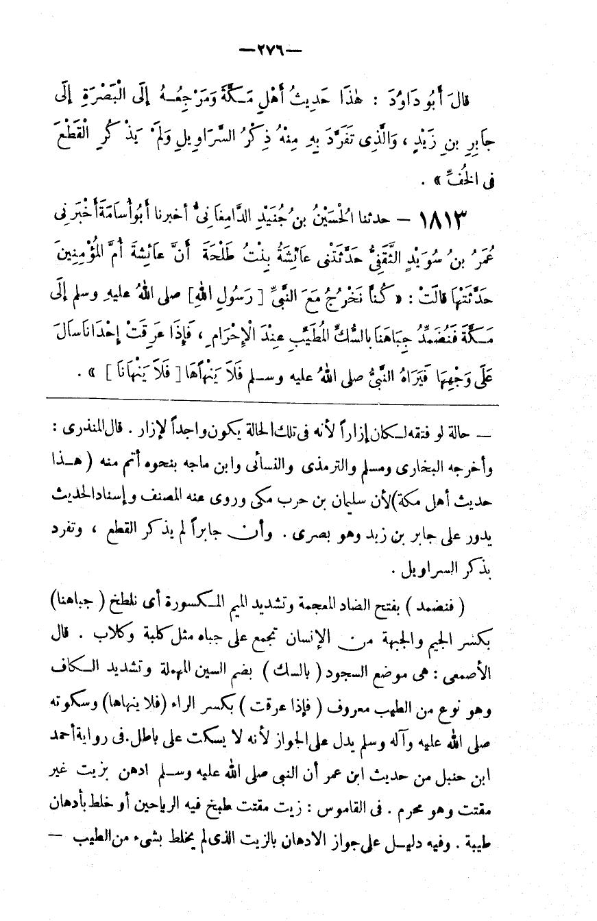: وَسُكُوته صَلَّى اللَّه عَلَيْهِ وَآله وَسَلَّمَ يَدُلّ عَلَى الْجَوَاز لِأَنَّهُ لَا يَسْكُت عَلَى بَاطِل فِي رِوَايَة أَحْمَد بْن حَنْبَل مِنْ حَدِيث اِبْن عُمَر أَنَّ النَّبِيّ صَلَّى اللَّه عَلَيْهِ وَسَلَّمَ اِدَّهَنَ بِزَيْتٍ غَيْر مُقَتَّت وَهُوَ مُحْرِم . فِي الْقَامُوس : زَيْت مُقَتَّت طُبِخَ فِيهِ الرَّيَاحِين أَوْ خُلِطَ بِأَدْهَانٍ طَيِّبَة . وَفِيهِ دَلِيل عَلَى جَوَاز الِادِّهَان بِالزَّيْتِ الَّذِي لَمْ يُخْلَط بِشَيْءٍ مِنْ الطِّيب@