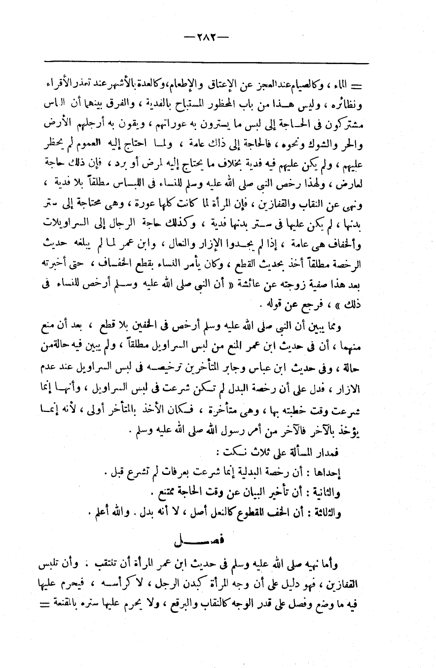 الماء وكالصيام عند العجز عن الإعتاق والإطعام وكالعدة بالأشهر عند تعذر الأقراء ونظائره وليس هذا من باب المحظور المستباح بالفدية والفرق بينهما أن الناس مشتركون في الحاجة إلى لبس ما يسترون به عوراتهم ويقون به أرجلهم الأرض والحر والشوك ونحوه فالحاجة إلى ذلك عامة ولما احتاج إليه العموم لم يحظر عليهم ولم يكن عليهم فيه فائدة بخلاف ما يحتاج إليه لمرض أو برد فإن ذلك حاجة لعارض ولهذا رخص النبي صلى الله عليه و سلم للنساء في اللباس مطلقا بلا فدية ونهى عن النقاب والقفازين فإن المرأة لما كانت كلها عورة وهي محتاجة إلى ستر بدنها لم يكن عليها في ستر بدنها فدية وكذلك حاجة الرجال إلى السراويلات والخفاف هي عامة إذا لم يجدوا الإزار والنعال وابن عمر لما لم يبلغه حديث الرخصة مطلقا أخذ بحديث القطع وكان يأمر النساء بقطع الخفاف حتى أخبرته بعد هذا صفية زوجته عن عائشة أن النبي صلى الله عليه و سلم أرخص للنساء في ذلك فرجع عن قوله