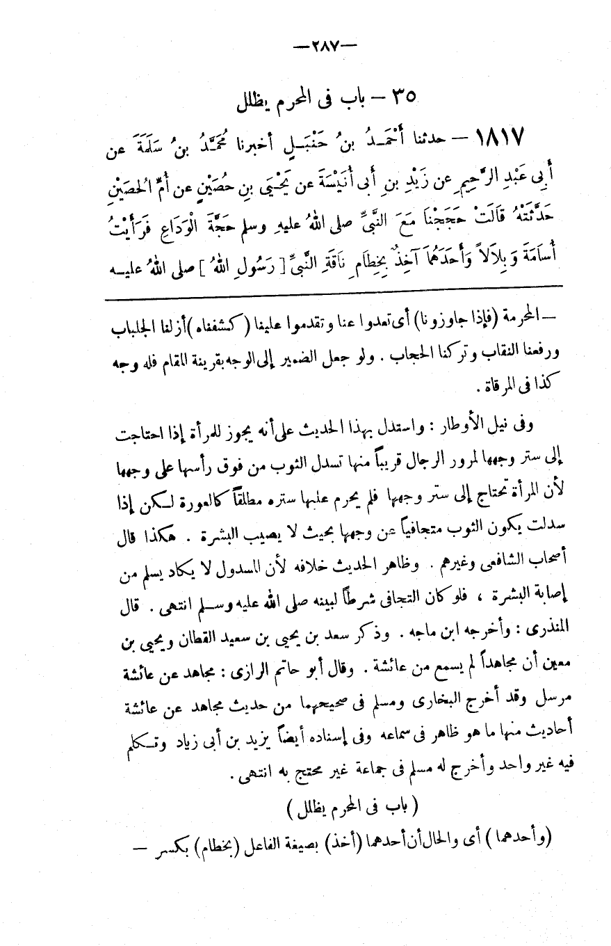 وَفِي نَيْل الْأَوْطَار : وَاسْتُدِلَّ بِهَذَا الْحَدِيث عَلَى أَنَّهُ يَجُوز لِلْمَرْأَةِ إِذَا اِحْتَاجَتْ إِلَى سَتْر وَجْههَا لِمُرُورِ الرِّجَال قَرِيبًا مِنْهَا تَسْدُل الثَّوْب مِنْ فَوْق رَأْسهَا عَلَى وَجْههَا لِأَنَّ الْمَرْأَة تَحْتَاج إِلَى سَتْر وَجْههَا فَلَمْ يَحْرُم عَلَيْهَا سَتْره مُطْلَقًا كَالْعَوْرَةِ لَكِنْ إِذَا سَدَلَتْ يَكُون الثَّوْب مُتَجَافِيًا عَنْ وَجْههَا بِحَيْثُ لَا يُصِيب الْبَشَرَة . هَكَذَا قَالَ أَصْحَاب الشَّافِعِيّ وَغَيْرهمْ . وَظَاهِر الْحَدِيث خِلَافه لِأَنَّ الْمَسْدُول لَا يَكَاد يَسْلَم مِنْ إِصَابَة الْبَشَرَة ، فَلَوْ كَانَ التَّجَافِي شَرْطًا لَبَيَّنَهُ اِنْتَهَى .