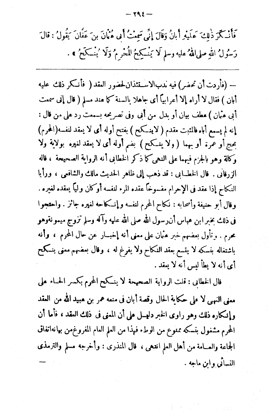 قَالَ الْخَطَّابِيُّ : قُلْت الرِّوَايَة الصَّحِيحَة لَا يَنْكِح الْمُحْرِم بِكَسْرِ الْحَاء عَلَى مَعْنَى النَّهْي لَا عَلَى حِكَايَة الْحَال وَقِصَّة أَبَان فِي مَنْعه عُمَر بْن عُبَيْد اللَّه مِنْ الْعَقْد وَإِنْكَاره ذَلِكَ وَهُوَ رَاوِي الْخَبَر دَلِيل عَلَى أَنَّ الْمَعْنَى فِي ذَلِكَ الْعَقْد ، فَأَمَّا إِنَّ الْمُحْرِم مَشْغُول بِنُسُكِهِ مَمْنُوع مِنْ الْوَطْء فَهَذَا مِنْ الْعِلْم الْعَامّ الْمَفْرُوغ مِنْ بَيَانه اِتِّفَاق الْجَمَاعَة وَالْعَامَّة مِنْ أَهْل الْعِلْم اِنْتَهَى .