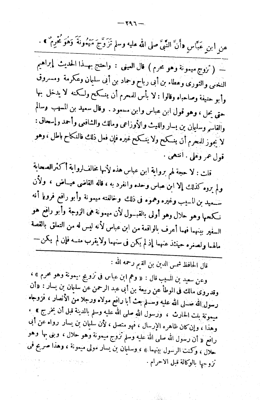 قال الحافظ شمس الدين بن القيم رحمه الله وعن سعيد بن المسيب قال وهم ابن عباس في تزويج ميمونة وهو محرم وقد روى مالك في الموطأ عن ربيعة بن أبي عبدالرحمن عن سليمان بن يسار أن رسول الله صلى الله عليه و سلم بعث أبا رافع مولاه ورجلا من الأنصار فزوجاه ميمونة بنت الحارث ورسول الله صلى الله عليه و سلم بالمدينة قبل أن يخرج وهذا وإن كان ظاهره الإرسال فهو متصل لأن سليمان بن يسار رواه عن أبي رافع أن رسول الله صلى الله عليه و سلم تزوج ميمونة وهو حلال وبنى بها وهو حلال وكنت الرسول بينهما وسليمان بن يسار مولى ميمونة وهذا صريح في تزوجها بالوكالة قبل الإحرام