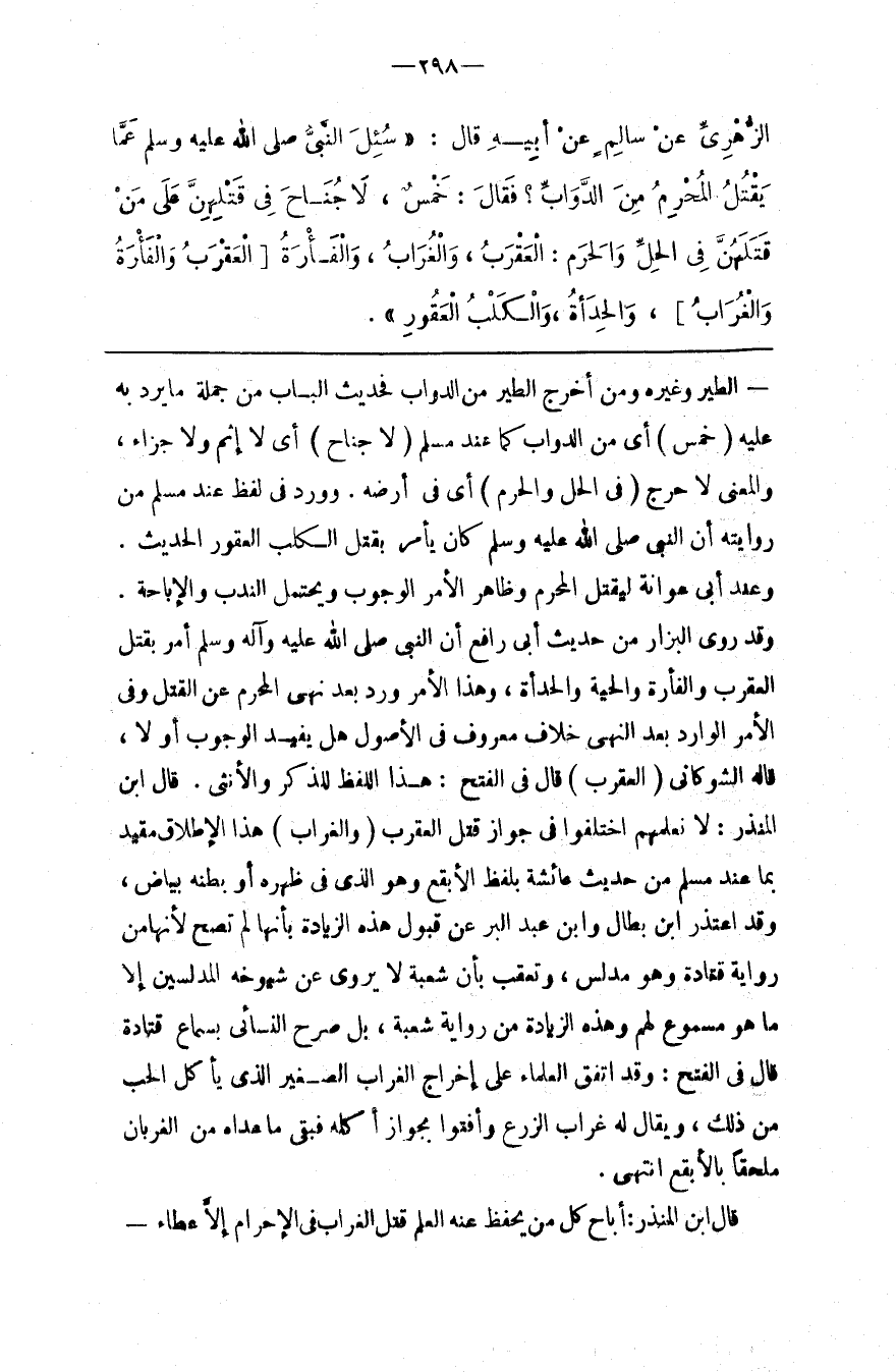 قَالَ اِبْن الْمُنْذِر : أَبَاحَ كُلّ مَنْ يُحْفَظ عَنْهُ الْعِلْم قَتْل الْغُرَاب فِي الْإِحْرَام إِلَّا عَطَاء@