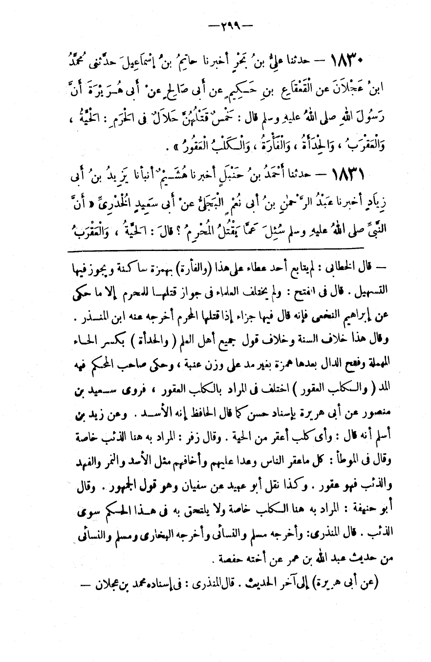 وَعَنْ زَيْد بْن أَسْلَم أَنَّهُ قَالَ : وَأَيّ كَلْب أَعْقَر مِنْ الْحَيَّة . وَقَالَ زُفَر : الْمُرَاد بِهِ هُنَا الذِّئْب خَاصَّة وَقَالَ فِي الْمُوَطَّأ : كُلّ مَا عَقَرَ النَّاس وَعَدَا عَلَيْهِمْ وَأَخَافَهُمْ مِثْل الْأَسَد وَالنَّمِر وَالْفَهْد وَالذِّئْب فَهُوَ عَقُور . وَكَذَا نَقَلَ أَبُو عُبَيْد عَنْ سُفْيَان وَهُوَ قَوْل الْجُمْهُور . وَقَالَ أَبُو حَنِيفَة : الْمُرَاد بِهِ هُنَا الْكَلْب خَاصَّة وَلَا يَلْتَحِق بِهِ فِي هَذَا الْحُكْم سِوَى الذِّئْب .