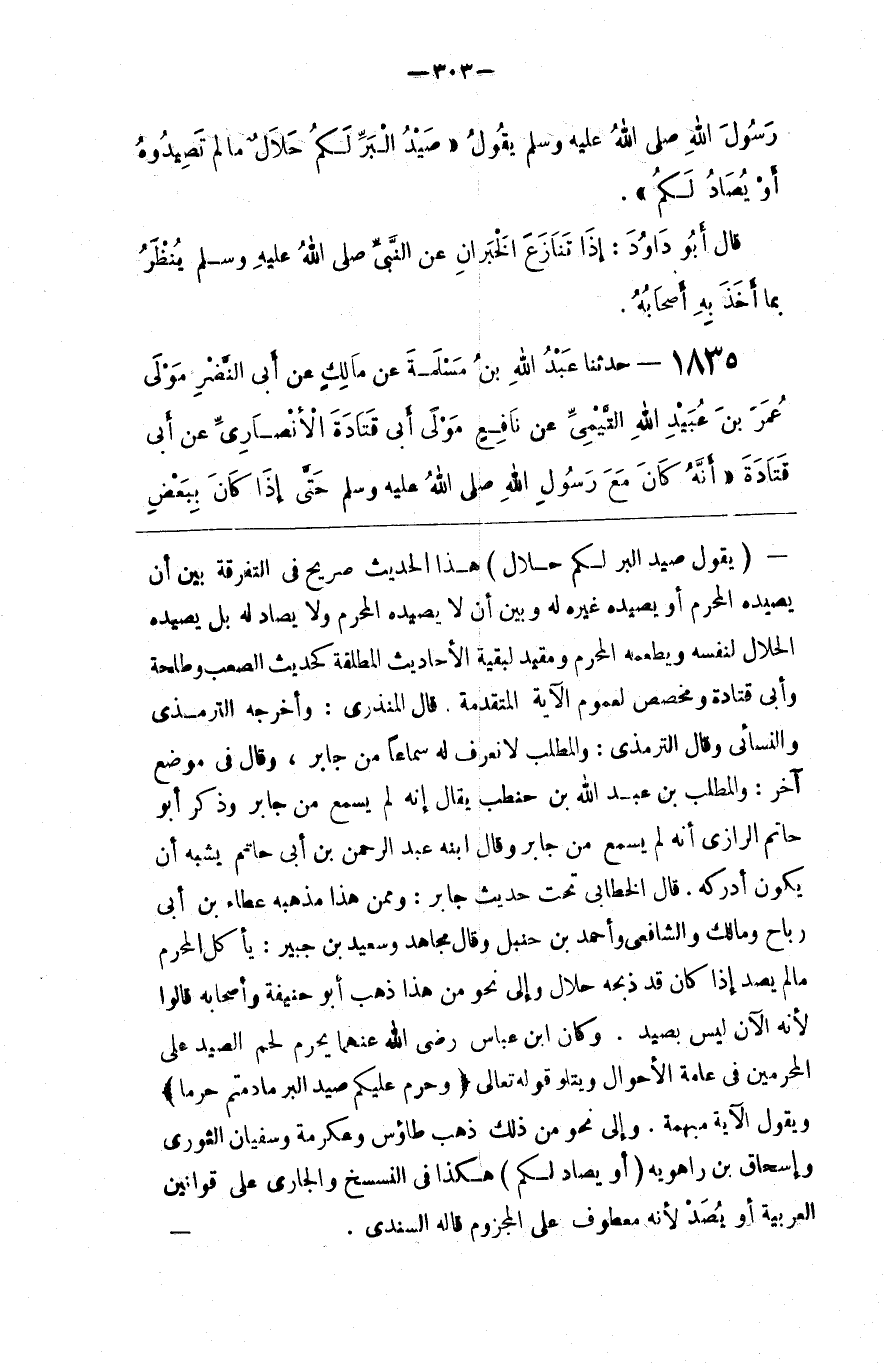 قَالَ الْمُنْذِرِيُّ : وَأَخْرَجَهُ التِّرْمِذِيّ وَالنَّسَائِيُّ وَقَالَ التِّرْمِذِيّ : وَالْمُطَّلِب لَا نَعْرِف لَهُ سَمَاعًا مِنْ جَابِر ، وَقَالَ فِي مَوْضِع آخَر : وَالْمُطَّلِب بْن عَبْد اللَّه بْن حَنْطَب يُقَال إِنَّهُ لَمْ يَسْمَع مِنْ جَابِر وَذَكَرَ أَبُو حَاتِم الرَّازِيّ أَنَّهُ لَمْ يَسْمَع مِنْ جَابِر وَقَالَ اِبْنه عَبْد الرَّحْمَن بْن أَبِي حَاتِم يُشْبِه أَنْ يَكُون أَدْرَكَهُ . قَالَ الْخَطَّابِيُّ تَحْت حَدِيث جَابِر : وَمِمَّنْ هَذَا مَذْهَبه عَطَاء بْن أَبِي رَبَاح وَمَالِك وَالشَّافِعِيّ وَأَحْمَد بْن حَنْبَل وَقَالَ مُجَاهِد وَسَعِيد اِبْن جُبَيْر : يَأْكُل الْمُحْرِم مَا لَمْ يَصِدْ إِذَا كَانَ قَدْ ذَبَحَهُ حَلَال وَإِلَى نَحْو مِنْ هَذَا ذَهَبَ أَبُو حَنِيفَة وَأَصْحَابه قَالُوا لِأَنَّهُ الْآن لَيْسَ بِصَيْدٍ . وَكَانَ اِبْن عَبَّاس يُحَرِّم لَحْم الصَّيْد عَلَى الْمُحْرِمِينَ فِي عَامَّة الْأَحْوَال وَيَتْلُو قَوْله تَعَالَى { وَحَرَّمَ عَلَيْكُمْ صَيْد الْبَرّ مَا دُمْتُمْ حُرُمًا } وَيَقُول الْآيَة مُبْهَمَة . وَإِلَى نَحْو مِنْ ذَلِكَ ذَهَبَ طَاوُسٌ وَعِكْرِمَة وَسُفْيَان الثَّوْرِيّ وَإِسْحَاق بْن رَاهْوَيْهِ