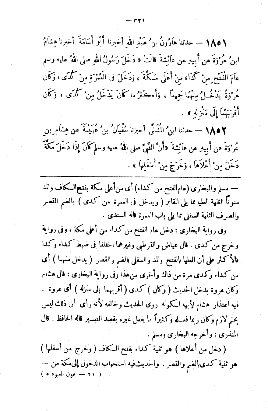 وَفِي رِوَايَة الْبُخَارِيّ : دَخَلَ عَام الْفَتْح مِنْ كَدَاء مِنْ أَعْلَى مَكَّة ، وَفِي رِوَايَة وَخَرَجَ مِنْ كُدًى قَالَ عِيَاض ، وَالْقُرْطُبِيّ وَغَيْرهمَا اِخْتَلَفَا فِي ضَبْط كَدَاء وَكُدًى فَالْأَكْثَر عَلَى أَنَّ الْعُلْيَا بِالْفَتْحِ وَالْمَدّ وَالسُّفْلَى بِالضَّمِّ وَالْقَصْر