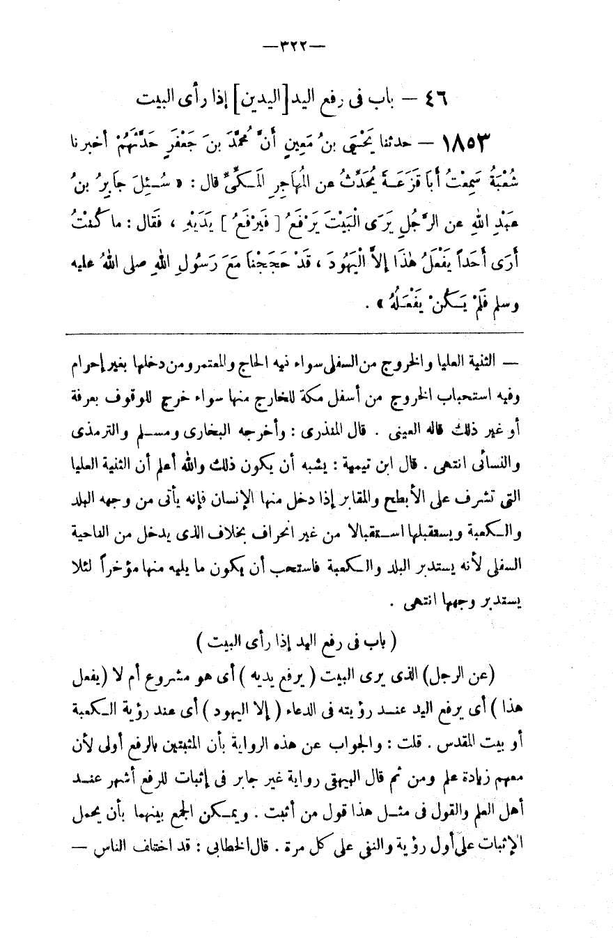 قَالَ الْمُنْذِرِيُّ : وَأَخْرَجَهُ الْبُخَارِيّ وَمُسْلِم وَالتِّرْمِذِيّ وَالنَّسَائِيُّ ، انْتَهَى . قَالَ اِبْن تَيْمِيَة : يُشْبِه أَنْ يَكُون ذَلِكَ وَاَللَّه أَعْلَم أَنَّ الثَّنِيَّة الْعُلْيَا الَّتِي تُشْرِف عَلَى الْأَبْطَح وَالْمَقَابِر إِذَا دَخَلَ مِنْهَا الْإِنْسَان فَإِنَّهُ يَأْتِي مِنْ وِجْهة الْبَلَد وَالْكَعْبَة وَيَسْتَقْبِلهَا اِسْتِقْبَالًا مِنْ غَيْر اِنْحِرَاف بِخِلَافِ الَّذِي يَدْخُل مِنْ النَّاحِيَة السُّفْلَى لِأَنَّهُ يَسْتَدْبِر الْبَلَد وَالْكَعْبَة مُسْتَحَبّ أَنْ يَكُون مَا يَلِيه مِنْهَا مُؤَخَّرًا لِئَلَّا يَسْتَدْبِر وَجْههَا اِنْتَهَى .