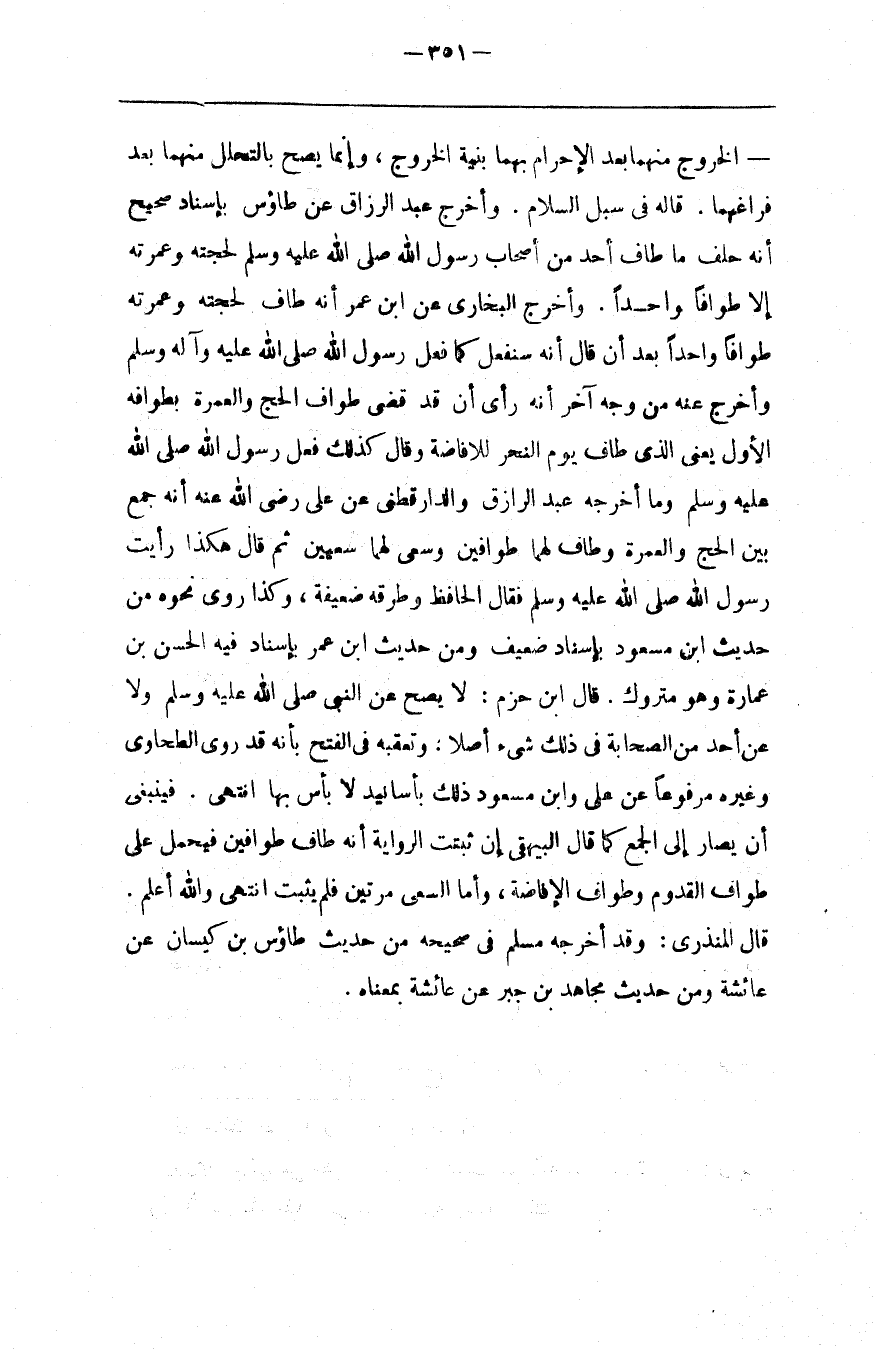 الْخُرُوج مِنْهُمَا بَعْد الْإِحْرَام بِهِمَا بِنِيَّةِ الْخُرُوج ، وَإِنَّمَا يَصِحّ بِالتَّحَلُّلِ مِنْهُمَا بَعْد فَرَاغهمَا . قَالَهُ فِي سُبُل السَّلَام . وَأَخْرَجَ عَبْد الرَّزَّاق عَنْ طَاوُسٍ بِإِسْنَادٍ صَحِيح أَنَّهُ حَلَفَ مَا طَافَ أَحَد مِنْ أَصْحَاب رَسُول اللَّه صَلَّى اللَّه عَلَيْهِ وَسَلَّمَ لِحَجَّتِهِ وَعُمْرَته إِلَّا طَوَافًا وَاحِدًا . وَأَخْرَجَ الْبُخَارِيّ عَنْ اِبْن عُمَر أَنَّهُ طَافَ لِحَجَّتِهِ وَعُمْرَته طَوَافًا وَاحِدًا بَعْد أَنْ قَالَ إِنَّهُ سَنَفْعَلُ كَمَا فَعَلَ رَسُول اللَّه صَلَّى اللَّه عَلَيْهِ وَآلِهِ وَسَلَّمَ وَأُخْرِجَ عَنْهُ مِنْ وَجْه آخَر أَنَّهُ رَأَى أَنْ قَدْ قَضَى طَوَاف الْحَجّ وَالْعُمْرَة بِطَوَافِهِ الْأَوَّل يَعْنِي الَّذِي طَافَ يَوْم النَّحْر لِلْإِفَاضَةِ وَقَالَ كَذَلِكَ فَعَلَ رَسُول اللَّه صَلَّى اللَّه عَلَيْهِ وَسَلَّمَ وَمَا أَخْرَجَهُ عَبْد الرَّزَّاق وَالدَّارَقُطْنِيّ عَنْ عَلِيّ رَضِيَ اللَّه عَنْهُ أَنَّهُ جَمَعَ بَيْن الْحَجّ وَالْعُمْرَة وَطَافَ لَهُمَا طَوَافَيْنِ وَسَعَى لَهُمَا سَعْيَيْنِ ثُمَّ قَالَ هَكَذَا رَأَيْت رَسُول اللَّه صَلَّى اللَّه عَلَيْهِ وَسَلَّمَ فَقَالَ الْحَافِظ وَطُرُقه ضَعِيفَة ، وَكَذَا رَوَى نَحْوه مِنْ حَدِيث اِبْن مَسْعُود بِإِسْنَادٍ ضَعِيف وَمِنْ حَدِيث اِبْن عُمَر بِإِسْنَادٍ فِيهِ الْحَسَن بْن عُمَارَة وَهُوَ مَتْرُوك . قَالَ اِبْن حَزْم : لَا يَصِحّ عَنْ النَّبِيّ صَلَّى اللَّه عَلَيْهِ وَسَلَّمَ وَلَا عَنْ أَحَد مِنْ الصَّحَابَة فِي ذَلِكَ شَيْء أَصْلًا : وَتَعَقَّبَهُ فِي الْفَتْح بِأَنَّهُ قَدْ رَوَى الطَّحَاوِيُّ وَغَيْره مَرْفُوعًا عَنْ عَلِيّ وَابْن مَسْعُود ذَلِكَ بِأَسَانِيد لَا بَأْس بِهَا اِنْتَهَى . فَيَنْبَغِي أَنْ يُصَار إِلَى الْجَمْع كَمَا قَالَ الْبَيْهَقِيُّ إِنْ ثَبَتَتْ الرِّوَايَة أَنَّهُ طَافَ طَوَافَيْنِ فَيُحْمَل عَلَى طَوَاف الْقُدُوم وَطَوَاف الْإِفَاضَة ، وَأَمَّا السَّعْي مَرَّتَيْنِ فَلَمْ يَثْبُت اِنْتَهَى وَاَللَّه أَعْلَم .