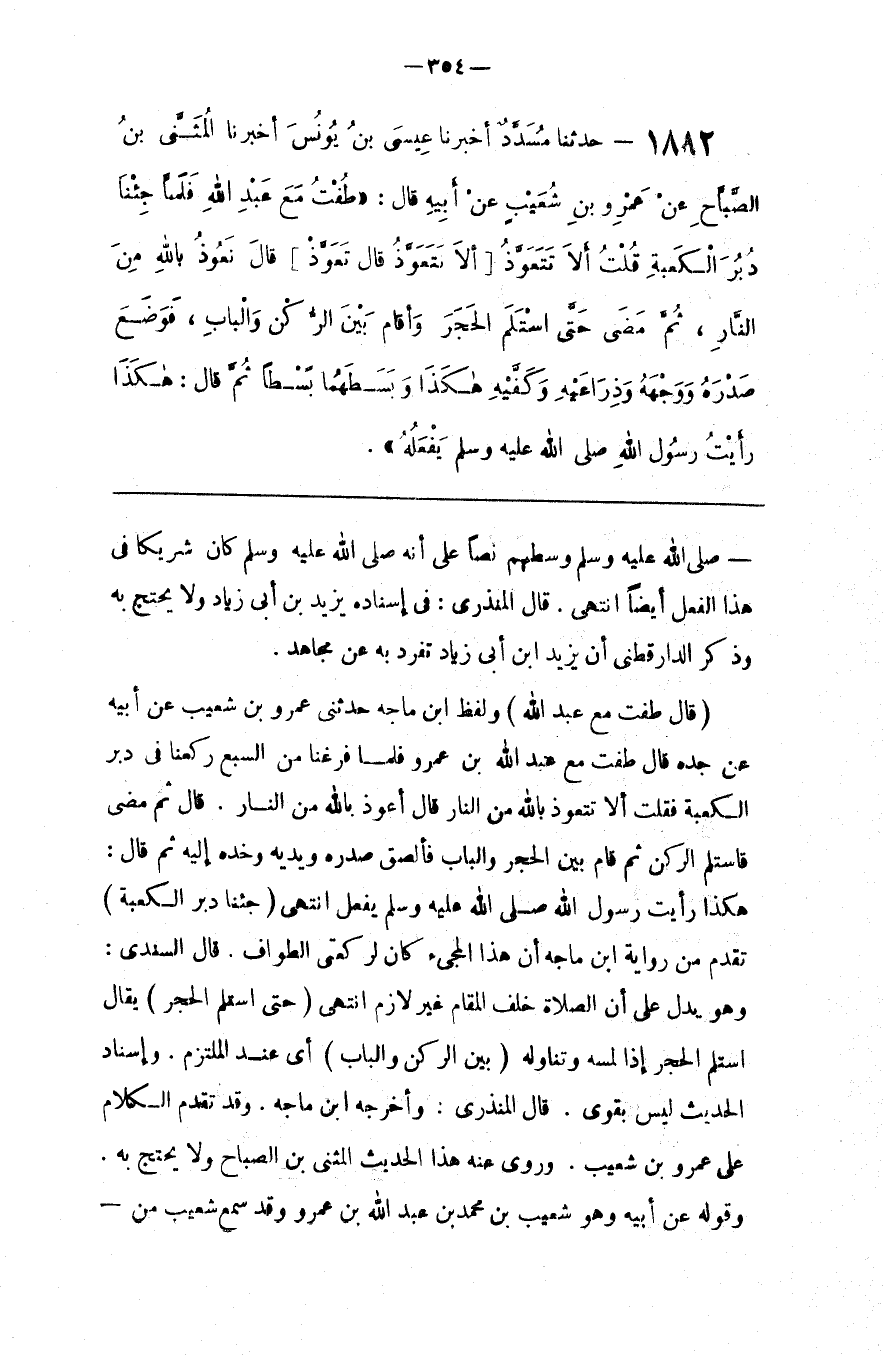 : وَلَفْظ اِبْن مَاجَهْ حَدَّثَنِي عَمْرو بْن شُعَيْب عَنْ أَبِيهِ عَنْ جَدّه قَالَ طُفْت مَعَ عَبْد اللَّه بْن عَمْرو فَلَمَّا فَرَغْنَا مِنْ السَّبْع رَكَعْنَا فِي دُبُر الْكَعْبَة فَقُلْت أَلَا تَتَعَوَّذ بِاَللَّهِ مِنْ النَّار قَالَ أَعُوذ بِاَللَّهِ مِنْ النَّار . قَالَ ثُمَّ مَضَى فَاسْتَلَمَ الرُّكْن ثُمَّ قَامَ بَيْن الْحَجَر وَالْبَاب فَأَلْصَقَ صَدْره وَيَدَيْهِ وَخَدّه إِلَيْهِ ثُمَّ قَالَ : هَكَذَا رَأَيْت رَسُول اللَّه صَلَّى اللَّه عَلَيْهِ وَسَلَّمَ يَفْعَل اِنْتَهَى