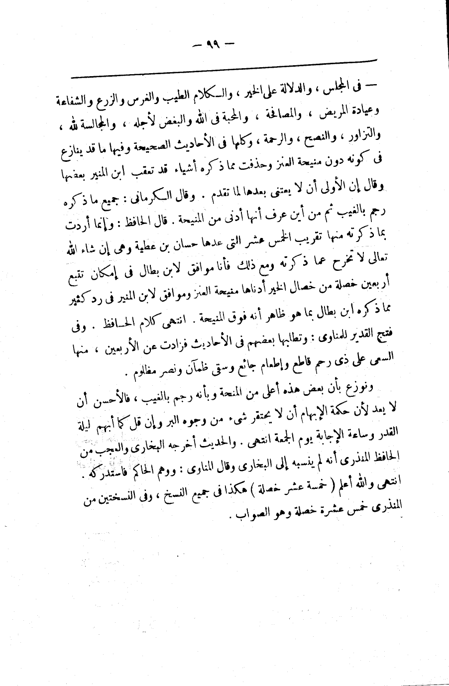 فِي الْمَجْلِس ، وَالدَّلَالَة عَلَى الْخَيْر ، وَالْكَلَام الطَّيِّب وَالْغَرْس وَالزَّرْع وَالشَّفَاعَة وَعِيادَة الْمَرِيض ، وَالْمُصَافَحَة ، وَالْمَحَبَّة فِي اللَّه وَالْبُغْض لِأَجْلِهِ ، وَالْمُجَالَسَة لِلَّهِ ، وَالتَّزَاوُر ، وَالنُّصْح ، وَالرَّحْمَة ، وَكُلّهَا فِي الْأَحَادِيث الصَّحِيحَة وَفِيهَا مَا قَدْ يُنَازَع فِي كَوْنه دُون مَنِيحَة الْعَنْز وَحَذَفْت مِمَّا ذَكَرَهُ أَشْيَاء قَدْ تَعَقَّبَ اِبْن الْمُنِير بَعْضهَا وَقَالَ إِنَّ الْأَوْلَى أَنْ لَا يُعْتَنَى بَعْدهَا لِمَا تَقَدَّمَ . وَقَالَ الْكَرْمَانِيُّ : جَمِيع مَا ذَكَرَهُ رَجْم بِالْغَيْبِ ثُمَّ مِنْ أَيْنَ عَرَفَ أَنَّهَا أَدْنَى مِنْ الْمَنِيحَة . قَالَ الْحَافِظ : وَإِنَّمَا أَرَدْت بِمَا ذَكَرْته مِنْهَا تَقْرِيب الْخَمْس عَشَر الَّتِي عَدَّهَا حَسَّان بْن عَطِيَّة وَهِيَ إِنْ شَاءَ اللَّه تَعَالَى لَا تَخْرُج عَمَّا ذَكَرْته وَمَعَ ذَلِكَ فَأَنَا مُوَافِق لِابْنِ بَطَّال فِي إِمْكَان تَتَبُّع أَرْبَعِينَ خَصْلَة مِنْ خِصَال الْخَيْر أَدْنَاهَا مَنِيحَة الْعَنْز وَمُوَافِق لِابْنِ الْمُنِير فِي رَدّ كَثِير مِمَّا ذَكَرَهُ اِبْن بَطَّال بِمَا هُوَ ظَاهِر أَنَّهُ فَوْق الْمَنِيحَة . اِنْتَهَى كَلَام الْحَافِظ . وَفِي فَتْح الْقَدِير لِلْمُنَاوِيِِّ : وَتَطَلَّبَهَا بَعْضهمْ فِي الْأَحَادِيث فَزَادَتْ عَنْ الْأَرْبَعِينَ ، مِنْهَا السَّعْي عَلَى ذِي رَحِم قَاطِع وَإِطْعَام جَائِع وَسَقْي ظَمْآن وَنَصْر مَظْلُوم .