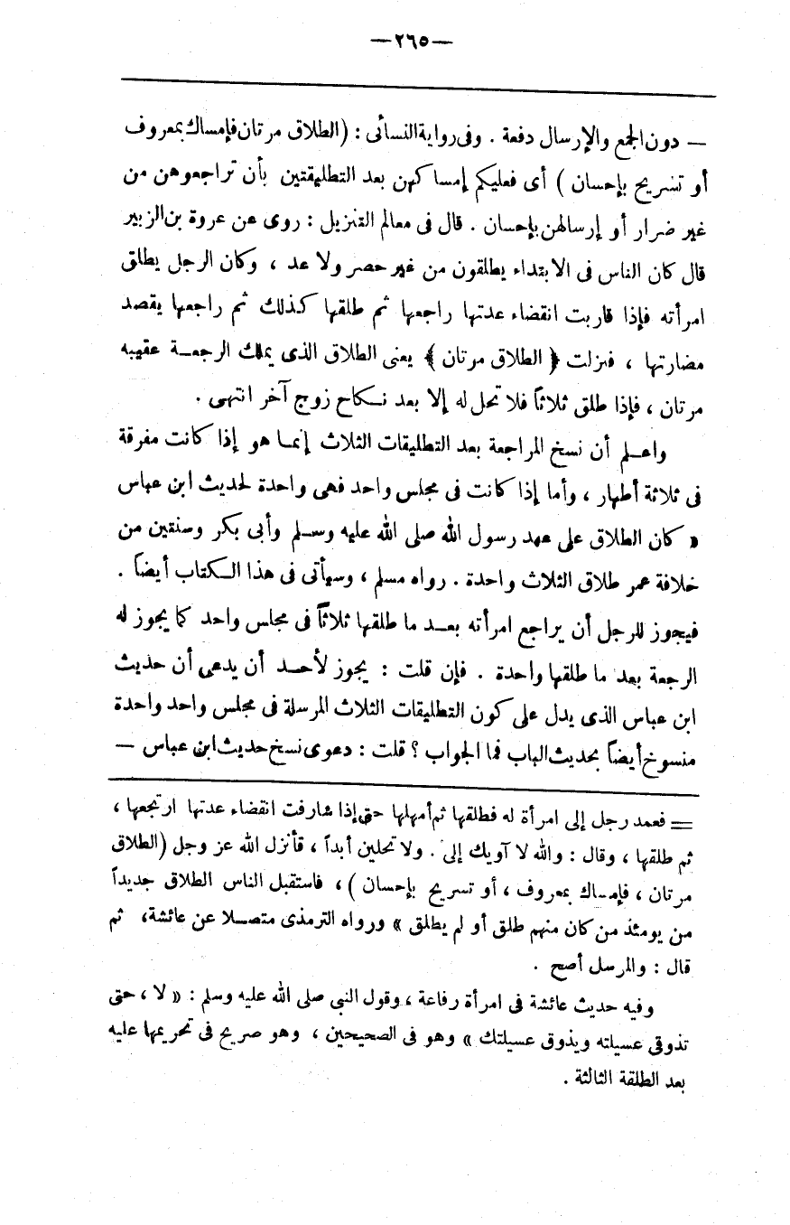 دُون الْجَمْع وَالْإِرْسَال دَفْعَة . وَفِي رِوَايَة النَّسَائِيِّ : { الطَّلَاق مَرَّتَانِ فَإِمْسَاك بِمَعْرُوفٍ أَوْ تَسْرِيح بِإِحْسَانٍ } : أَيْ فَعَلَيْكُمْ إِمْسَاكهنَّ بَعْد التَّطْلِيقَتَيْنِ بِأَنْ تُرَاجِعُوهُنَّ مِنْ غَيْر ضِرَار أَوْ إِرْسَالهنَّ بِإِحْسَانٍ . قَالَ فِي مَعَالِم التَّنْزِيل : رُوِيَ عَنْ عُرْوَة بْن الزُّبَيْر قَالَ كَانَ النَّاس فِي الِابْتِدَاء يُطَلِّقُونَ مِنْ غَيْر حَصْر وَلَا عَدّ ، وَكَانَ الرَّجُل يُطَلِّق اِمْرَأَته فَإِذَا قَارَبَتْ اِنْقِضَاء عِدَّتهَا رَاجَعَهَا ثُمَّ طَلَّقَهَا كَذَلِكَ ثُمَّ رَاجَعَهَا يَقْصِد مُضَارَّتهَا ، فَنَزَلَتْ { الطَّلَاق مَرَّتَانِ } يَعْنِي الطَّلَاق الَّذِي يَمْلِك الرَّجْعَة عَقِيبه مَرَّتَانِ ، فَإِذَا طَلَّقَ ثَلَاثًا فَلَا تَحِلّ لَهُ إِلَّا بَعْد نِكَاح زَوْج آخَر اِنْتَهَى .