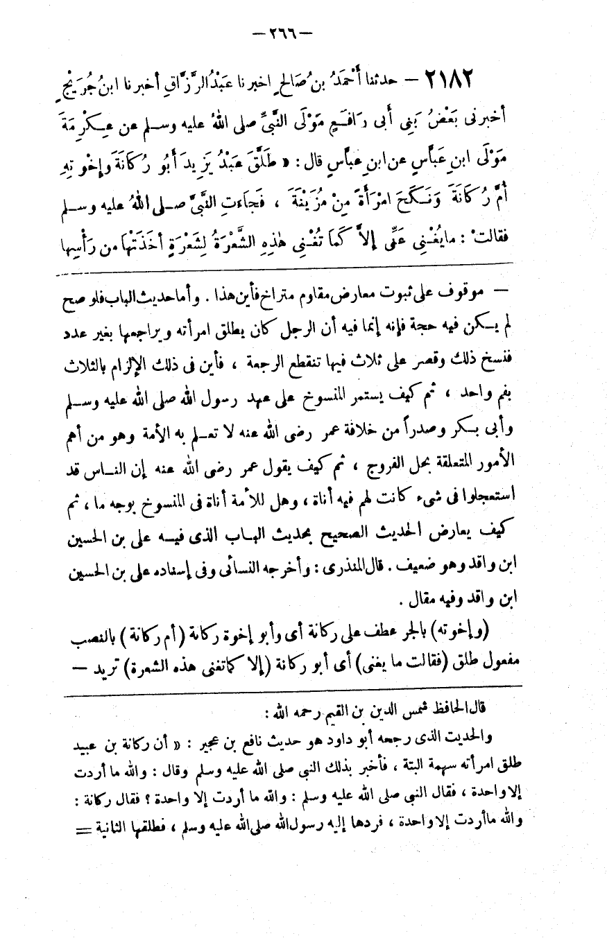 مَوْقُوف عَلَى ثُبُوت مُعَارِض مُقَاوِم مُتَرَاخٍ فَأَيْنَ هَذَا . وَأَمَّا حَدِيث الْبَاب فَلَوْ صَحَّ لَمْ يَكُنْ فِيهِ حُجَّة فَإِنَّهُ إِنَّمَا فِيهِ أَنَّ الرَّجُل كَانَ يُطَلِّق اِمْرَأَته وَيُرَاجِعهَا بِغَيْرِ عَدَد فَنُسِخَ ذَلِكَ وَقُصِرَ عَلَى ثَلَاث فِيهَا تَنْقَطِع الرَّجْعَة ، فَأَيْنَ فِي ذَلِكَ الْإِلْزَام بِالثَّلَاثِ بِفَمٍ وَاحِد ، ثُمَّ كَيْفَ يَسْتَمِرّ الْمَنْسُوخ عَلَى عَهْد رَسُول اللَّه صَلَّى اللَّه عَلَيْهِ وَسَلَّمَ وَأَبِي بَكْر وَصَدْرًا مِنْ خِلَافَة عُمَر رَضِيَ اللَّه عَنْهُ لَا تَعْلَم بِهِ الْأُمَّة وَهُوَ مِنْ أَهَمّ الْأُمُور الْمُتَعَلِّقَة بِحِلِّ الْفُرُوج ، ثُمَّ كَيْفَ يَقُول عُمَر رَضِيَ اللَّه عَنْهُ إِنَّ النَّاس قَدْ اِسْتَعْجَلُوا فِي شَيْء كَانَتْ لَهُمْ فِيهِ أَنَاة ، وَهَلْ لِلْأُمَّةِ أَنَاة فِي الْمَنْسُوخ بِوَجْهٍ مَا ، ثُمَّ كَيْفَ يُعَارَض الْحَدِيث الصَّحِيح بِحَدِيثِ الْبَاب الَّذِي فِيهِ عَلِيّ بْن الْحُسَيْن بْن وَاقِد وَهُوَ ضَعِيف .