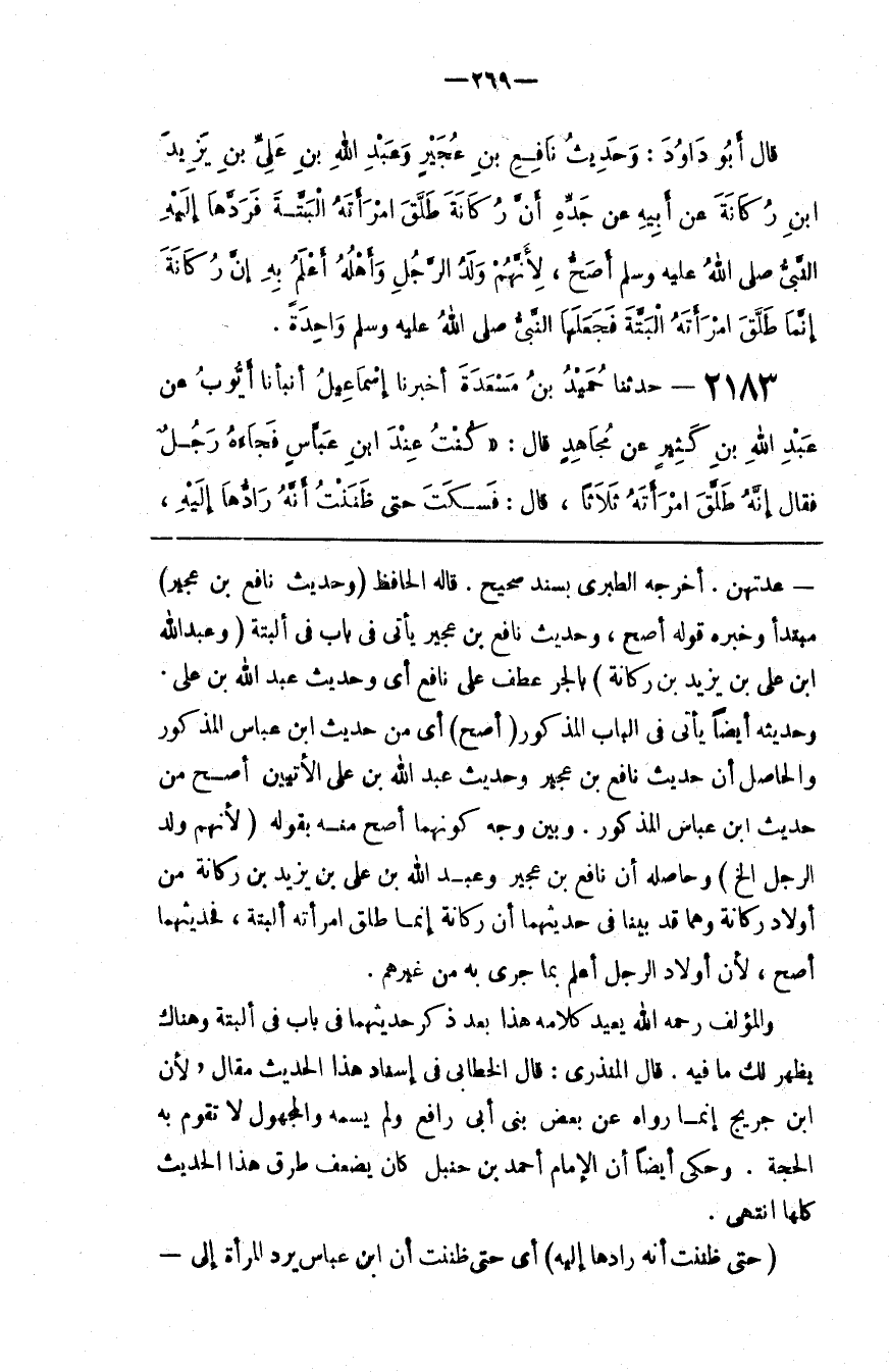وَالْمُؤَلِّف رَحِمَهُ اللَّه يُعِيد كَلَامه هَذَا بَعْد ذِكْر حَدِيثهمَا فِي بَاب فِي أَلْبَتَّةَ وَهُنَاكَ يَظْهَر لَك مَا فِيهِ .