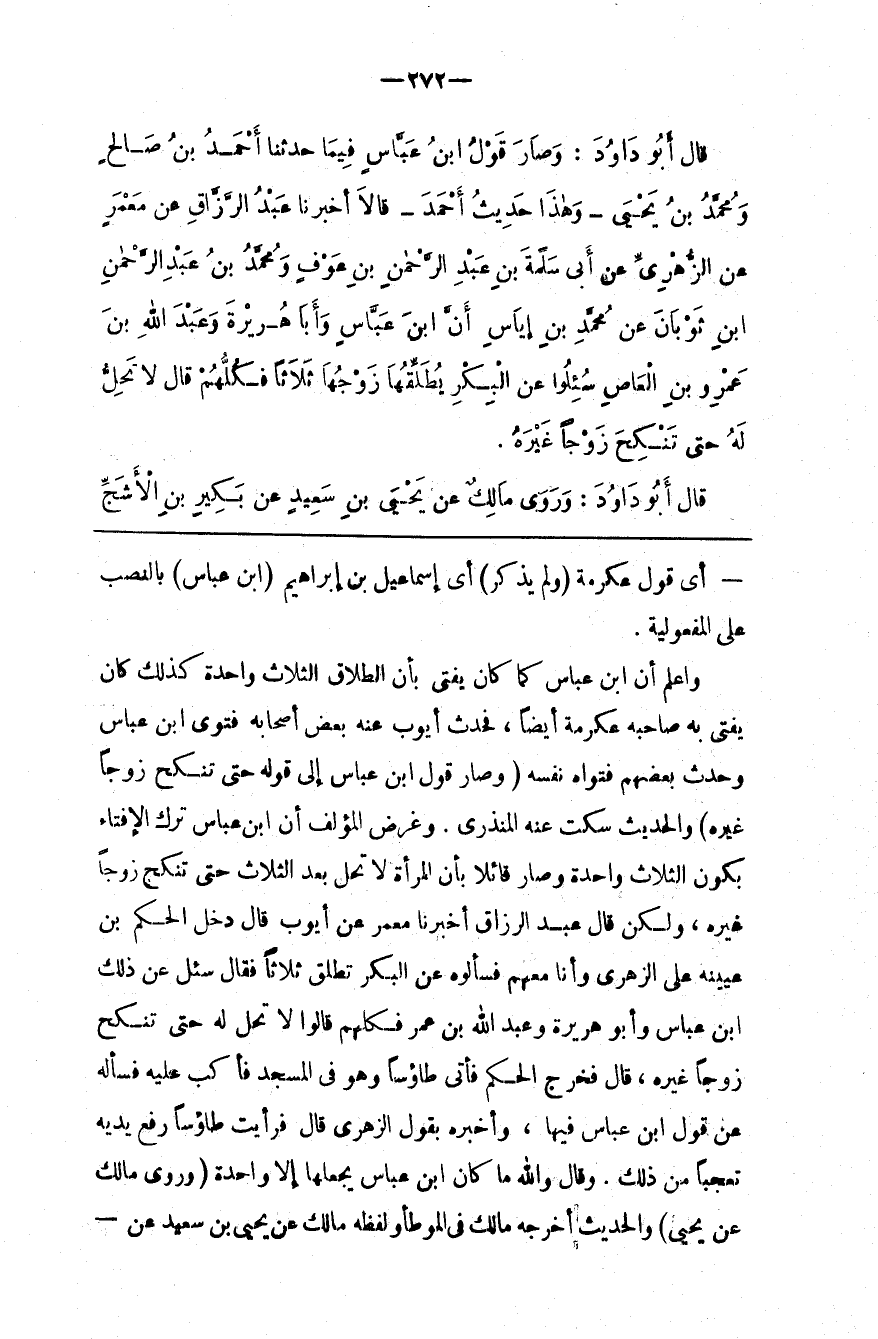 وَالْحَدِيث سَكَتَ عَنْهُ الْمُنْذِرِيُّ . وَغَرَض الْمُؤَلِّف أَنَّ اِبْن عَبَّاس تَرَكَ الْإِفْتَاء بِكَوْنِ الثَّلَاث وَاحِدَة وَصَارَ قَائِلًا بِأَنَّ الْمَرْأَة لَا تَحِلّ بَعْد الثَّلَاث حَتَّى تَنْكِح زَوْجًا غَيْره ، وَلَكِنْ قَالَ عَبْد الرَّزَّاق أَخْبَرَنَا مَعْمَر عَنْ أَيُّوب قَالَ دَخَلَ الْحَكَم بْن عُيَيْنَةَ عَلَى الزُّهْرِيّ وَأَنَا مَعَهُمْ فَسَأَلُوهُ عَنْ الْبِكْر تُطَلَّق ثَلَاثًا فَقَالَ سُئِلَ عَنْ ذَلِكَ اِبْن عَبَّاس وَأَبُو هُرَيْرَة وَعَبْد اللَّه بْن عُمَر فَكُلّهمْ قَالُوا لَا تَحِلّ لَهُ حَتَّى تَنْكِح زَوْجًا غَيْره ، قَالَ فَخَرَجَ الْحَكَم فَأَتَى طَاوُسًا وَهُوَ فِي الْمَسْجِد فَأَكَبَّ عَلَيْهِ فَسَأَلَهُ عَنْ قَوْل اِبْن عَبَّاس فِيهَا ، وَأَخْبَرَهُ بِقَوْلِ الزُّهْرِيّ قَالَ فَرَأَيْت طَاوُسًا رَفَعَ يَدَيْهِ تَعَجُّبًا مِنْ ذَلِكَ . وَقَالَ وَاَللَّه مَا كَانَ اِبْن عَبَّاس يَجْعَلهَا إِلَّا وَاحِدَة