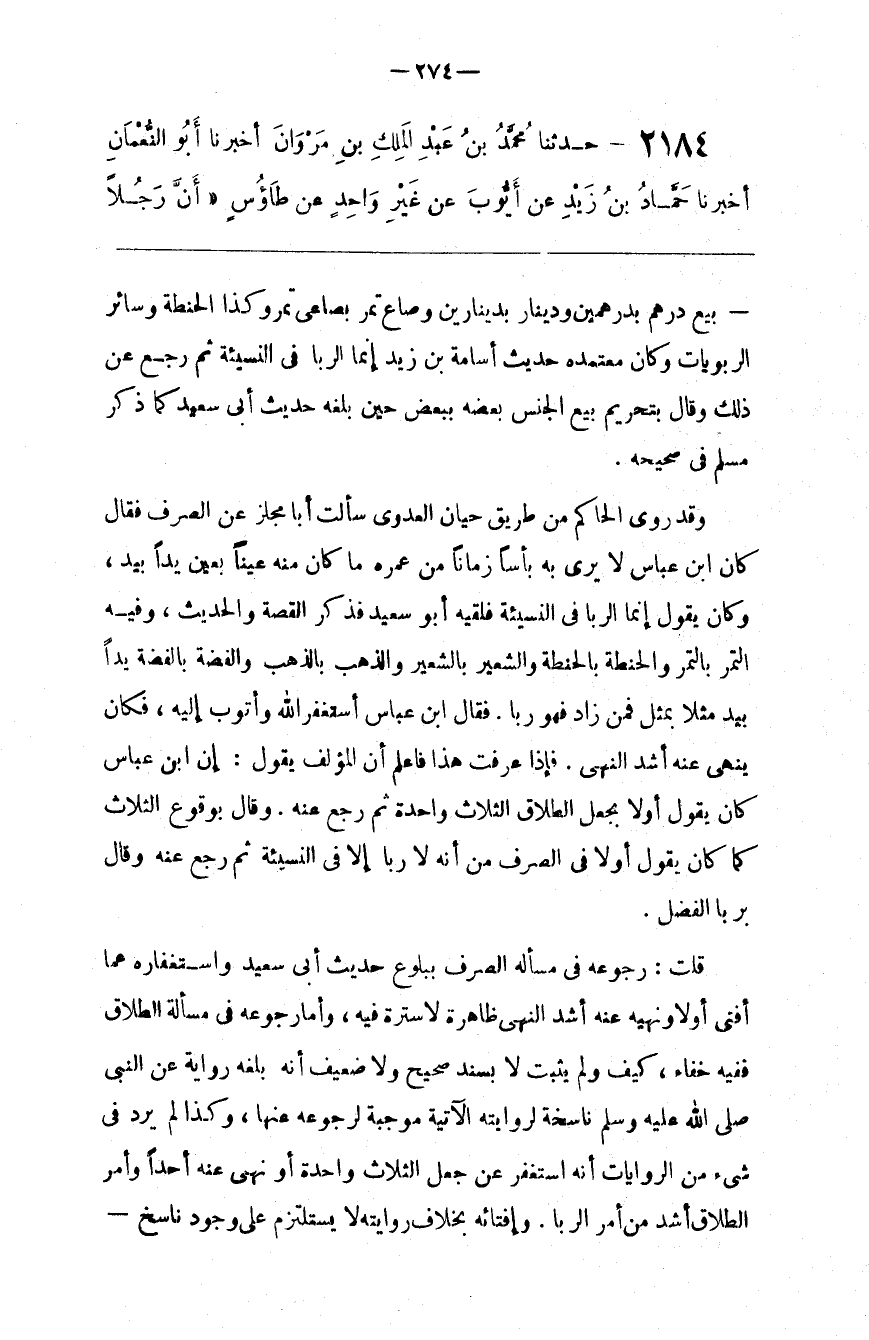 وَقَدْ رَوَى الْحَاكِم مِنْ طَرِيق حَيَّان الْعَدَوِيِّ سَأَلْت أَبَا مِجْلَز عَنْ الصَّرْف فَقَالَ كَانَ اِبْن عَبَّاس لَا يَرَى بِهِ بَأْسًا زَمَانًا مِنْ عُمْره مَا كَانَ مِنْهُ عَيْنًا بِعَيْنٍ يَدًا بِيَدٍ ، وَكَانَ يَقُول إِنَّمَا الرِّبَا فِي النَّسِيئَة فَلَقِيَهُ أَبُو سَعِيد فَذَكَرَ الْقِصَّة وَالْحَدِيث ، وَفِيهِ التَّمْر بِالتَّمْرِ وَالْحِنْطَة بِالْحِنْطَةِ وَالشَّعِير بِالشَّعِيرِ وَالذَّهَب بِالذَّهَبِ وَالْفِضَّة بِالْفِضَّةِ يَدًا بِيَدٍ مِثْلًا بِمِثْلٍ فَمَنْ زَادَ فَهُوَ رِبًا . فَقَالَ اِبْن عَبَّاس أَسْتَغْفِر اللَّه وَأَتُوب إِلَيْهِ ، فَكَانَ يَنْهَى عَنْهُ أَشَدّ النَّهْي . فَإِذَا عَرَفْت هَذَا فَاعْلَمْ أَنَّ الْمُؤَلِّف يَقُول : إِنَّ اِبْن عَبَّاس كَانَ يَقُول أَوَّلًا بِجَعْلِ الطَّلَاق الثَّلَاث وَاحِدَة ثُمَّ رَجَعَ عَنْهُ . وَقَالَ بِوُقُوعِ الثَّلَاث كَمَا كَانَ يَقُول أَوَّلًا فِي الصَّرْف مِنْ أَنَّهُ لَا رِبَا إِلَّا فِي النَّسِيئَة ثُمَّ رَجَعَ عَنْهُ وَقَالَ بِرِبَا الْفَضْل .