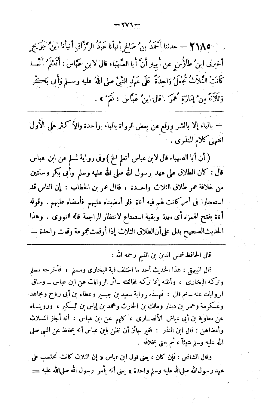 : وَفِي رِوَايَة لِمُسْلِمٍ عَنْ اِبْن عَبَّاس قَالَ : كَانَ الطَّلَاق عَلَى عَهْد رَسُول اللَّه صَلَّى اللَّه عَلَيْهِ وَسَلَّمَ وَأَبِي بَكْر وَسَنَتَيْنِ مِنْ خِلَافَة عُمَر طَلَاق الثَّلَاث وَاحِدَة ، فَقَالَ عُمَر بْن الْخَطَّاب : إِنَّ النَّاس قَدْ اِسْتَعْجَلُوا فِي أَمْر كَانَتْ لَهُمْ فِيهِ أَنَاة فَلَوْ أَمْضَيْنَاهُ عَلَيْهِمْ فَأَمْضَاهُ عَلَيْهِمْ . وَقَوْله أَنَاة بِفَتْحِ الْهَمْزَة أَيْ مُهْلَة وَبَقِيَّة اِسْتِمْتَاع لِانْتِظَارِ الْمُرَاجَعَة قَالَهُ النَّوَوِيّ . وَهَذَا الْحَدِيث الصَّحِيح يَدُلّ عَلَى أَنَّ الطَّلَاق الثَّلَاث إِذَا أُوقِعَتْ مَجْمُوعَة وَقَعَتْ وَاحِدَة @