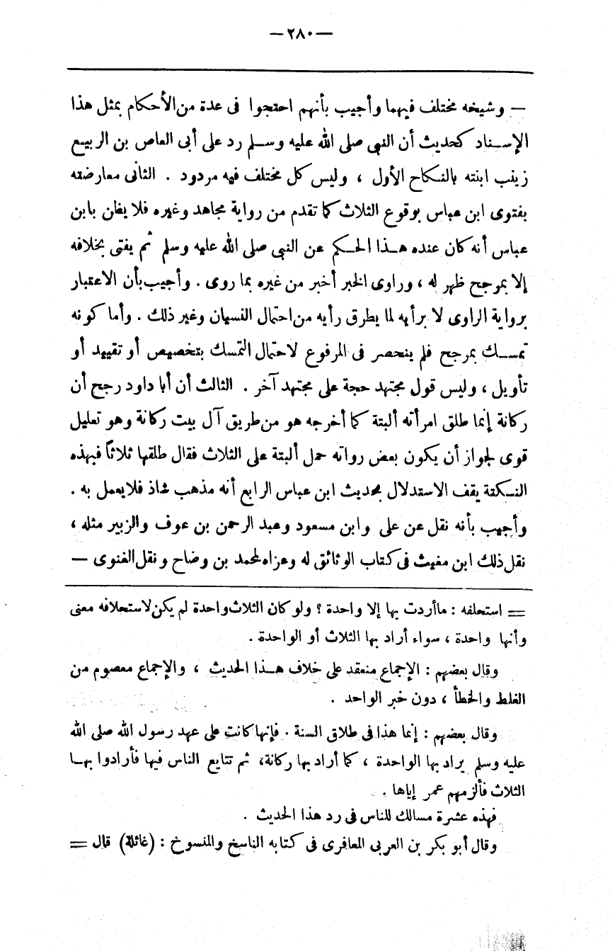وَشَيْخه مُخْتَلَف فِيهِمَا وَأُجِيبَ بِأَنَّهُمْ اِحْتَجُّوا فِي عِدَّة مِنْ الْأَحْكَام بِمِثْلِ هَذَا الْإِسْنَاد كَحَدِيثِ أَنَّ النَّبِيّ صَلَّى اللَّه عَلَيْهِ وَسَلَّمَ رَدَّ عَلَى أَبِي الْعَاصِ بْن الرَّبِيع زَيْنَب اِبْنَته بِالنِّكَاحِ الْأَوَّل ، وَلَيْسَ كُلّ مُخْتَلَف فِيهِ مَرْدُود . الثَّانِي مُعَارَضَته بِفَتْوَى اِبْن عَبَّاس بِوُقُوعِ الثَّلَاث كَمَا تَقَدَّمَ مِنْ رِوَايَة مُجَاهِد وَغَيْره فَلَا يُظَنّ بِابْنِ عَبَّاس أَنَّهُ كَانَ عِنْده هَذَا الْحُكْم عَنْ النَّبِيّ صَلَّى اللَّه عَلَيْهِ وَسَلَّمَ ثُمَّ يُفْتِي بِخِلَافِهِ إِلَّا بِمُرَجِّحٍ ظَهَرَ لَهُ ، وَرَاوِي الْخَبَر أَخْبَر مِنْ غَيْره بِمَا رَوَى . وَأُجِيبَ بِأَنَّ الِاعْتِبَار بِرِوَايَةِ الرَّاوِي لَا بِرَأْيِهِ لِمَا يَطْرُق رَأْيه مِنْ اِحْتِمَال النِّسْيَان وَغَيْر ذَلِكَ . وَأَمَّا كَوْنه تَمَسَّكَ بِمُرَجِّحٍ فَلَمْ يَنْحَصِر فِي الْمَرْفُوع لِاحْتِمَالِ التَّمَسُّك بِتَخْصِيصٍ أَوْ تَقْيِيد أَوْ تَأْوِيل ، وَلَيْسَ قَوْل مُجْتَهِد حُجَّة عَلَى مُجْتَهِد آخَر . الثَّالِث أَنَّ أَبَا دَاوُدَ رَجَّحَ أَنَّ رُكَانَة إِنَّمَا طَلَّقَ اِمْرَأَته أَلْبَتَّةَ كَمَا أَخْرَجَهُ هُوَ مِنْ طَرِيق آلِ بَيْت رُكَانَة وَهُوَ تَعْلِيل قَوِيّ لِجَوَازِ أَنْ يَكُون بَعْض رُوَاته حَمَلَ أَلْبَتَّةَ عَلَى الثَّلَاث فَقَالَ طَلِّقْهَا ثَلَاثًا فَبِهَذِهِ النُّكْتَة يَقِف الِاسْتِدْلَال بِحَدِيثِ اِبْن عَبَّاس الرَّابِع أَنَّهُ مَذْهَب شَاذّ فَلَا يُعْمَل بِهِ . وَأُجِيبَ بِأَنَّهُ نُقِلَ عَنْ عَلِيّ وَابْن مَسْعُود وَعَبْد الرَّحْمَن بْن عَوْف وَالزُّبَيْر مِثْله ، نَقَلَ ذَلِكَ اِبْن مُغِيث فِي كِتَاب الْوَثَائِق لَهُ وَعَزَاهُ لِمُحَمَّدِ بْنِ وَضَّاح وَنَقَلَ الْغَنَوِيّ@