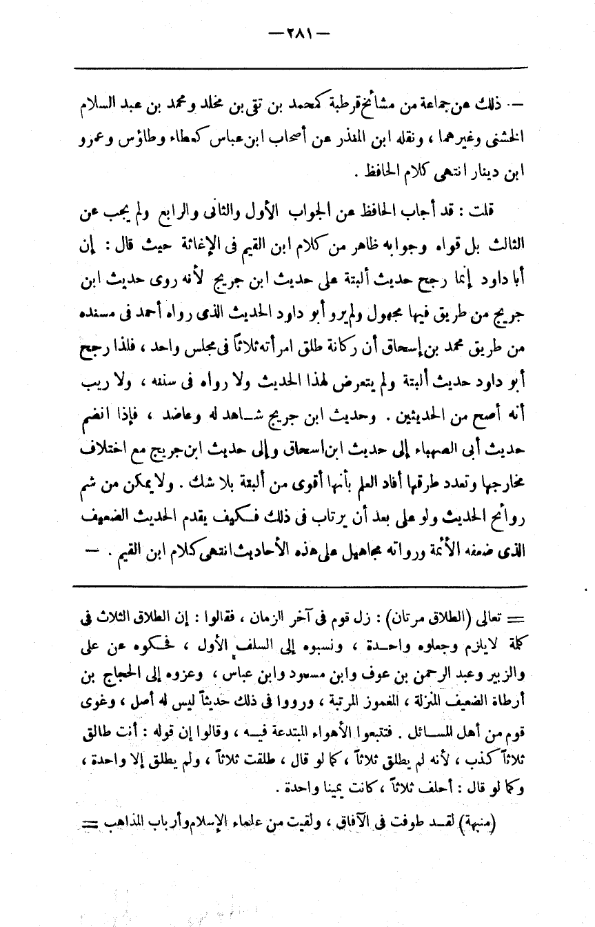 قُلْت : قَدْ أَجَابَ الْحَافِظ عَنْ الْجَوَاب الْأَوَّل وَالثَّانِي وَالرَّابِع وَلَمْ يُجِبْ عَنْ الثَّالِث بَلْ قَوَّاهُ وَجَوَابه ظَاهِر مِنْ كَلَام اِبْن الْقَيِّم فِي الْإِغَاثَة حَيْثُ قَالَ : إِنَّ أَبَا دَاوُدَ إِنَّمَا رَجَّحَ حَدِيث أَلْبَتَّةَ عَلَى حَدِيث اِبْن جُرَيْجٍ لِأَنَّهُ رَوَى حَدِيث اِبْن جُرَيْجٍ مِنْ طَرِيق فِيهَا مَجْهُول وَلَمْ يَرْوِ أَبُو دَاوُدَ الْحَدِيث الَّذِي رَوَاهُ أَحْمَد فِي مُسْنَده مِنْ طَرِيق مُحَمَّد بْن إِسْحَاق أَنَّ رُكَانَة طَلَّقَ اِمْرَأَته ثَلَاثًا فِي مَجْلِس وَاحِد ، فَلِذَا رَجَّحَ أَبُو دَاوُدَ حَدِيث أَلْبَتَّةَ وَلَمْ يَتَعَرَّض لِهَذَا الْحَدِيث وَلَا رَوَاهُ فِي سُنَنه ، وَلَا رَيْب أَنَّهُ أَصَحّ مِنْ الْحَدِيثَيْنِ . وَحَدِيث اِبْن جُرَيْجٍ شَاهِد لَهُ وَعَاضِد ، فَإِذَا اِنْضَمَّ حَدِيث أَبِي الصَّهْبَاء إِلَى حَدِيث اِبْن إِسْحَاق وَإِلَى حَدِيث اِبْن جُرَيْجٍ مَعَ اِخْتِلَاف مَخَارِجهَا وَتَعَدُّد طُرُقهَا أَفَادَ الْعِلْم بِأَنَّهَا أَقْوَى مِنْ أَلْبَتَّةَ بِلَا شَكّ . وَلَا يُمْكِن مَنْ شَمَّ رَوَائِح الْحَدِيث وَلَوْ عَلَى بُعْد أَنْ يَرْتَاب فِي ذَلِكَ فَكَيْفَ يُقَدِّم الْحَدِيث الضَّعِيف الَّذِي ضَعَّفَهُ الْأَئِمَّة وَرُوَاته مَجَاهِيل عَلَى هَذِهِ الْأَحَادِيث اِنْتَهَى كَلَام اِبْن الْقَيِّم .@