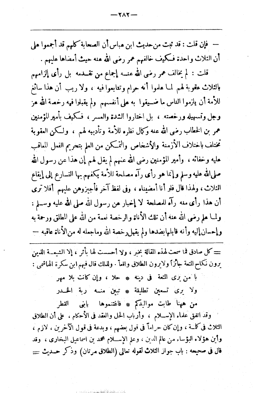 قُلْت : لَمْ يُخَالِف عُمَر رَضِيَ اللَّه عَنْهُ إِجْمَاع مَنْ تَقَدَّمَهُ بَلْ رَأَى إِلْزَامهمْ بِالثَّلَاثِ عُقُوبَة لَهُمْ لَمَّا عَلِمُوا أَنَّهُ حَرَام وَتَتَابَعُوا فِيهِ ، وَلَا رَيْب أَنَّ هَذَا سَائِغ لِلْأُمَّةِ أَنْ يُلْزِمُوا النَّاس مَا ضَيَّقُوا بِهِ عَلَى أَنْفُسهمْ وَلَمْ يَقْبَلُوا فِيهِ رُخْصَة اللَّه عَزَّ وَجَلَّ وَتَسْهِيله وَرُخْصَته ، بَلْ اِخْتَارُوا الشِّدَّة وَالْعُسْر ، فَكَيْفَ بِأَمِيرِ الْمُؤْمِنِينَ عُمَر بْن الْخَطَّاب رَضِيَ اللَّه عَنْهُ وَكَمَال نَظَره لِلْأُمَّةِ وَتَأْدِيبه لَهُمْ ، وَلَكِنَّ الْعُقُوبَة تَخْتَلِف بِاخْتِلَافِ الْأَزْمِنَة وَالْأَشْخَاص وَالتَّمَكُّن مِنْ الْعِلْم بِتَحْرِيمِ الْفِعْل الْمُعَاقَب عَلَيْهِ وَخَفَائِهِ ، وَأَمِير الْمُؤْمِنِينَ رَضِيَ اللَّه عَنْهُ لَمْ يَقُلْ لَهُمْ إِنَّ هَذَا عَنْ رَسُول اللَّه صَلَّى اللَّه عَلَيْهِ وَسَلَّمَ وَإِنَّمَا هُوَ رَأْي رَآهُ مَصْلَحَة لِلْأُمَّةِ يَكُفّهُمْ بِهَا التَّسَارُع إِلَى إِيقَاع الثَّلَاث ، وَلِهَذَا قَالَ فَلَوْ أَنَّا أَمْضَيْنَاهُ ، وَفِي لَفْظ آخَر فَأَجِيزُوهُنَّ عَلَيْهِمْ أَفَلَا تَرَى أَنَّ هَذَا رَأْي مِنْهُ رَآهُ لِلْمَصْلَحَةِ لَا إِخْبَار عَنْ رَسُول اللَّه صَلَّى اللَّه عَلَيْهِ وَسَلَّمَ ، وَلَمَّا عَلِمَ رَضِيَ اللَّه عَنْهُ أَنَّ تِلْكَ الْأَنَاة وَالرُّخْصَة نِعْمَة مِنْ اللَّه عَلَى الْمُطَلِّق وَرَحْمَة بِهِ وَإِحْسَان إِلَيْهِ وَأَنَّهُ قَابَلَهَا بِضِدِّهَا وَلَمْ يَقْبَل رُخْصَة اللَّه وَمَا جَعَلَهُ لَهُ مِنْ الْأَنَاة عَاقَبَهُ@