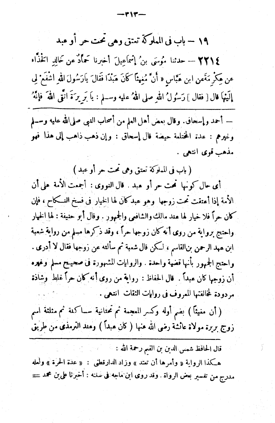 أَيْ حَال كَوْنهَا تَحْت حُرّ أَوْ عَبْد . قَالَ النَّوَوِيّ : أَجْمَعَتْ الْأُمَّة عَلَى أَنَّ الْأَمَة إِذَا أُعْتِقَتْ تَحْت زَوْجهَا وَهُوَ عَبْد كَانَ لَهَا الْخِيَار فِي فَسْخ النِّكَاح ، فَإِنْ كَانَ حُرًّا فَلَا خِيَار لَهَا عِنْد مَالِك وَالشَّافِعِيّ وَالْجُمْهُور . وَقَالَ أَبُو حَنِيفَة : لَهُ الْخِيَار وَاحْتُجَّ بِرِوَايَةِ مَنْ رَوَى أَنَّهُ كَانَ زَوْجهَا حُرًّا ، وَقَدْ ذَكَرَهَا مُسْلِم مِنْ رِوَايَة شُعْبَة بْن عَبْد الرَّحْمَن بْن الْقَاسِم ، لَكِنْ قَالَ شُعْبَة ثُمَّ سَأَلَتْهُ عَنْ زَوْجهَا فَقَالَ لَا أَدْرِي . وَاحْتَجَّ الْجُمْهُور بِأَنَّهَا قَضِيَّة وَاحِدَة . وَالرِّوَايَات الْمَشْهُورَة فِي صَحِيح مُسْلِم وَغَيْره أَنَّ زَوْجهَا كَانَ عَبْدًا . قَالَ الْحَافِظ : رِوَايَة مَنْ رَوَى أَنَّهُ كَانَ حُرًّا غَلَطٌ وَشَاذَّة مَرْدُودَة لِمُخَالَفَتِهَا الْمَعْرُوف فِي رِوَايَات الثِّقَات اِنْتَهَى .