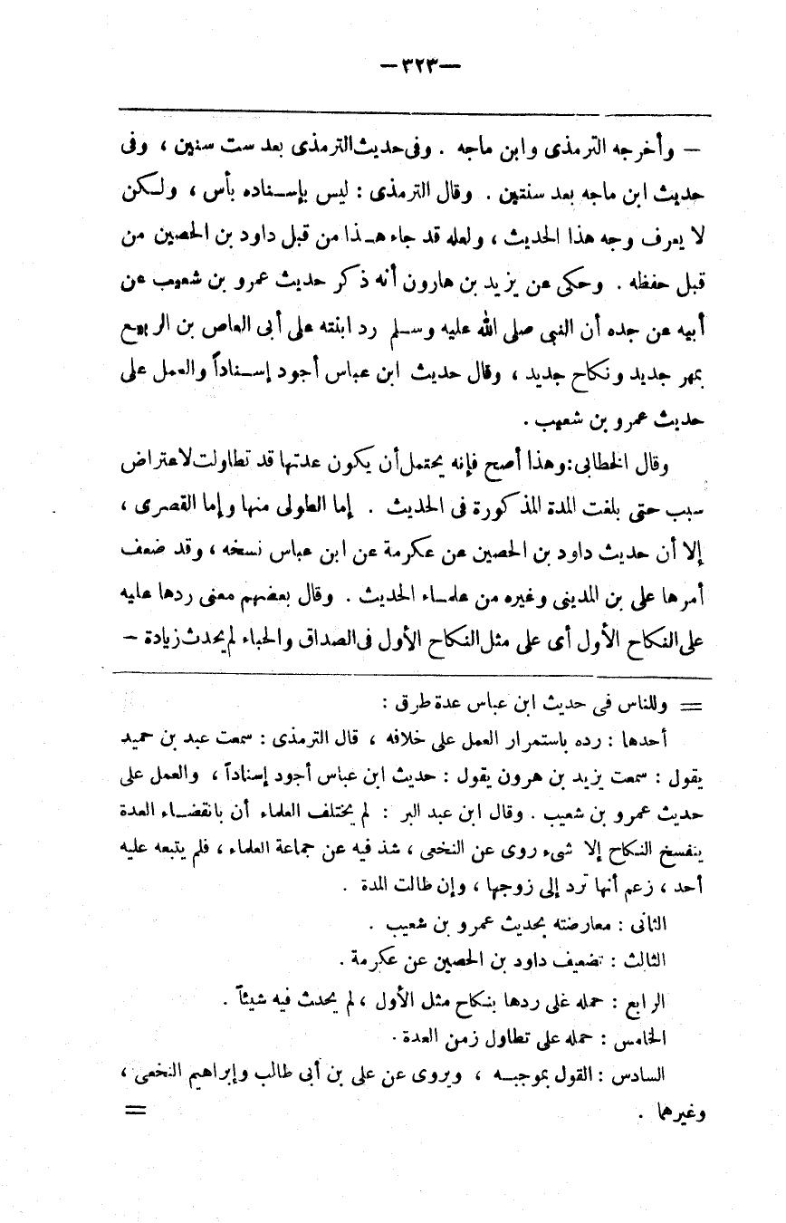 وَأَخْرَجَهُ التِّرْمِذِيّ وَابْن مَاجَهْ . وَفِي حَدِيث التِّرْمِذِيّ بَعْد سِتّ سِنِينَ ، وَفِي حَدِيث اِبْن مَاجَهْ بَعْد سَنَتَيْنِ . وَقَالَ التِّرْمِذِيّ : لَيْسَ بِإِسْنَادِهِ بَأْس ، وَلَكِنْ لَا يُعْرَف وَجْه هَذَا الْحَدِيث ، وَلَعَلَّهُ قَدْ جَاءَ هَذَا مِنْ قِبَل دَاوُد بْن الْحُصَيْن مِنْ قِبَل حِفْظه . وَحُكِيَ عَنْ يَزِيد بْن هَارُون أَنَّهُ ذَكَرَ حَدِيث عَمْرو بْن شُعَيْب عَنْ أَبِيهِ عَنْ جَدّه أَنَّ النَّبِيّ صَلَّى اللَّه عَلَيْهِ وَسَلَّمَ رَدَّ اِبْنَته عَلَى أَبِي الْعَاصِ بْن الرَّبِيع بِمَهْرٍ جَدِيد وَنِكَاح جَدِيد ، وَقَالَ حَدِيث اِبْن عَبَّاس أَجْوَد إِسْنَادًا وَالْعَمَل عَلَى حَدِيث عَمْرو بْن شُعَيْب . وَقَالَ الْخَطَّابِيّ : وَهَذَا أَصَحّ فَإِنَّهُ يَحْتَمِل أَنْ يَكُون عِدَّتهَا قَدْ تَطَاوَلَتْ لِاعْتِرَاضِ سَبَب حَتَّى بَلَغَتْ الْمُدَّة الْمَذْكُورَة فِي الْحَدِيث . إِمَّا الطُّولَى مِنْهَا وَإِمَّا الْقُصْرَى ، إِلَّا أَنَّ حَدِيث دَاوُدَ بْنِ الْحُصَيْن عَنْ عِكْرِمَة عَنْ اِبْن عَبَّاس نَسَخَهُ ، وَقَدْ ضَعَّفَ أَمْرهَا عَلِيّ بْن الْمَدِينِيّ وَغَيْره مِنْ عُلَمَاء الْحَدِيث . وَقَالَ بَعْضهمْ مَعْنَى رَدَّهَا عَلَيْهِ عَلَى النِّكَاح الْأَوَّل أَيْ عَلَى مِثْل النِّكَاح الْأَوَّل فِي الصَّدَاق وَالْحِبَاء لَمْ يَحْدُث زِيَادَة@
