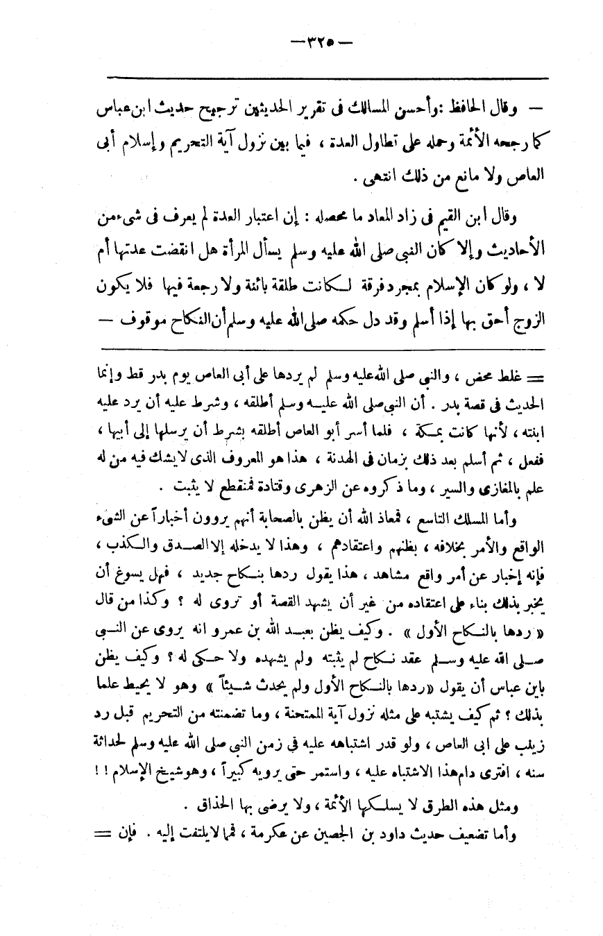 وَقَالَ الْحَافِظ : وَأَحْسَن الْمَسَالِك فِي تَقْرِير الْحَدِيثَيْنِ تَرْجِيح حَدِيث اِبْن عَبَّاس كَمَا رَجَّحَهُ الْأَئِمَّة وَحَمَلَهُ عَلَى تَطَاوُل الْعِدَّة ، فِيمَا بَيْن نُزُول آيَة التَّحْرِيم وَإِسْلَام أَبِي الْعَاصِ وَلَا مَانِع مِنْ ذَلِكَ اِنْتَهَى .