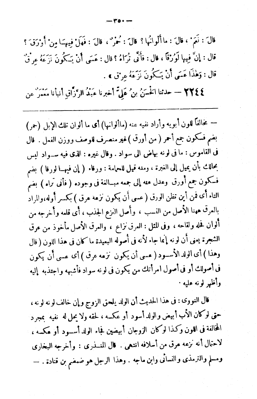قَالَ النَّوَوِيّ : فِي هَذَا الْحَدِيث أَنَّ الْوَلَد يَلْحَق الزَّوْج وَإِنْ خَالَفَ لَوْنه لَوْنه ، حَتَّى لَوْ كَانَ الْأَب أَبْيَض وَالْوَلَد أَسْوَد أَوْ عَكْسه ، لَحِقَهُ وَلَا يَحِلّ لَهُ نَفْيه بِمُجَرَّدِ الْمُخَالَفَة فِي اللَّوْن وَكَذَا لَوْ كَانَ الزَّوْجَانِ أَبْيَضَيْنِ فَجَاءَ الْوَلَد أَسْوَد أَوْ عَكْسه ، لِاحْتِمَالِ أَنَّهُ نَزَعَهُ عِرْق مِنْ أَسْلَافه اِنْتَهَى .