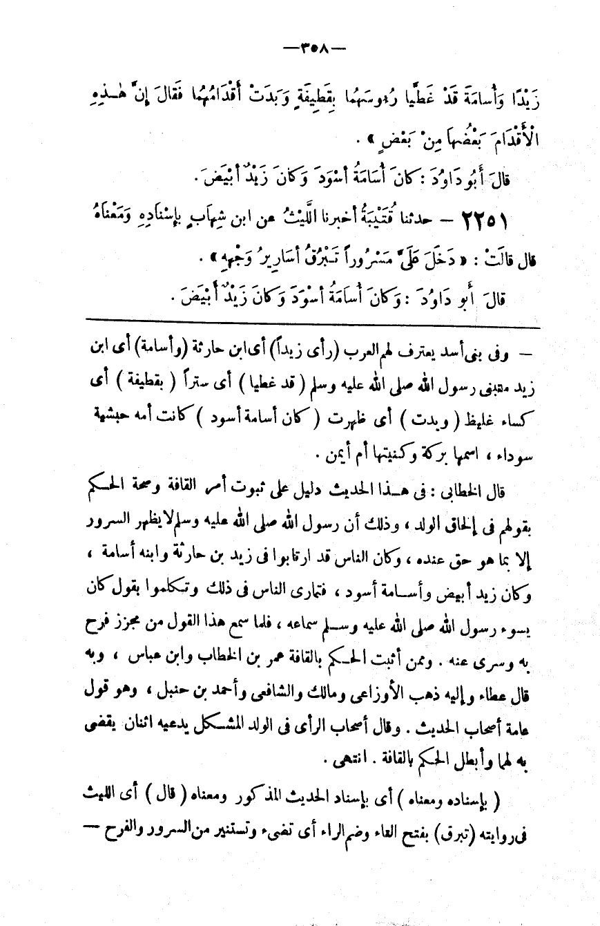 قَالَ الْخَطَّابِيّ : فِي هَذَا الْحَدِيث دَلِيل عَلَى ثُبُوت أَمْر الْقَافَة وَصِحَّة الْحُكْم بِقَوْلِهِمْ فِي إِلْحَاق الْوَلَد ، وَذَلِكَ أَنَّ رَسُول اللَّه صَلَّى اللَّه عَلَيْهِ وَسَلَّمَ لَا يُظْهِر السُّرُور إِلَّا بِمَا هُوَ حَقّ عِنْده ، وَكَانَ النَّاس قَدْ اِرْتَابُوا فِي زَيْد بْن حَارِثَة وَابْنه أُسَامَة ، وَكَانَ زَيْد أَبْيَض وَأُسَامَة أَسْوَد ، فَتَمَارَى النَّاس فِي ذَلِكَ وَتَكَلَّمُوا بِقَوْلٍ كَانَ يَسُوء رَسُول اللَّه صَلَّى اللَّه عَلَيْهِ وَسَلَّمَ سَمَاعه ، فَلَمَّا سَمِعَ هَذَا الْقَوْل مِنْ مُجَزِّز فَرِحَ بِهِ وَسُرِّيَ عَنْهُ . وَمِمَّنْ أَثْبَتَ الْحُكْم بِالْقَافَةِ عُمَر بْن الْخَطَّاب وَابْن عَبَّاس ، وَبِهِ قَالَ عَطَاء وَإِلَيْهِ ذَهَبَ الْأَوْزَاعِيُّ وَمَالِك وَالشَّافِعِيّ وَأَحْمَد بْن حَنْبَل ، وَهُوَ قَوْل عَامَّة أَصْحَاب الْحَدِيث .