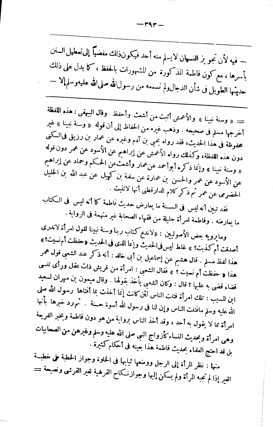 فِيهِ لِأَنَّ تَجْوِيز النِّسْيَان لَا يَسْلَم مِنْهُ أَحَد فَيَكُون ذَلِكَ مُفْضِيًا إِلَى تَعْطِيل السُّنَن بِأَسْرِهَا ، مَعَ كَوْن فَاطِمَة الْمَذْكُورَة مِنْ الْمَشْهُورَات بِالْحِفْظِ ، كَمَا يَدُلّ عَلَى ذَلِكَ حَدِيثهَا الطَّوِيل فِي شَأْن الدَّجَّال ، وَلَمْ تَسْمَعهُ مِنْ رَسُول اللَّه صَلَّى اللَّه عَلَيْهِ وَسَلَّمَ إِلَّا @