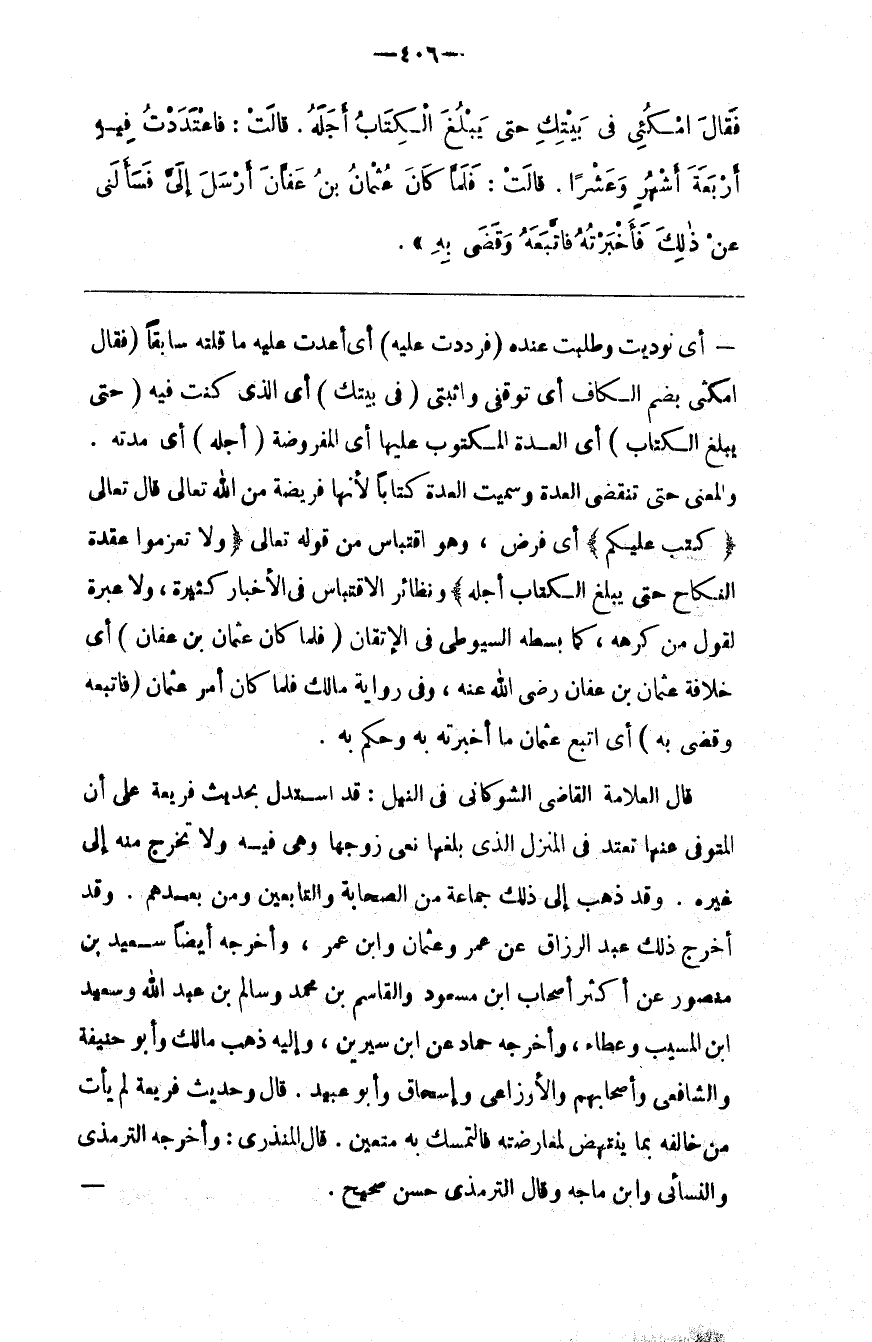 قَالَ الْعَلَّامَة الْقَاضِي الشَّوْكَانِيُّ فِي النَّيْل : قَدْ اُسْتُدِلَّ بِحَدِيثِ فُرَيْعَة عَلَى أَنَّ الْمُتَوَفَّى عَنْهَا تَعْتَدّ فِي الْمَنْزِل الَّذِي بَلَغَهَا نَعْيُ زَوْجهَا وَهِيَ فِيهِ ، وَلَا تَخْرُج مِنْهُ إِلَى غَيْره . وَقَدْ ذَهَبَ إِلَى ذَلِكَ جَمَاعَة مِنْ الصَّحَابَة وَالتَّابِعِينَ وَمَنْ بَعْدَهُمْ . وَقَدْ أَخْرَجَ ذَلِكَ عَبْد الرَّزَّاق عَنْ عُمَر وَعُثْمَان وَابْن عُمَر ، وَأَخْرَجَهُ أَيْضًا سَعِيد بْن مَنْصُور عَنْ أَكْثَر أَصْحَاب اِبْن مَسْعُود وَالْقَاسِم بْنُ مُحَمَّد وَسَالِم بْن عَبْد اللَّه وَسَعِيد بْن الْمُسَيِّب وَعَطَاء ، وَأَخْرَجَهُ حَمَّاد عَنْ اِبْن سِيرِينَ ، وَإِلَيْهِ ذَهَبَ مَالِك وَأَبُو حَنِيفَة وَالشَّافِعِيّ وَأَصْحَابهمْ وَالْأَوْزَاعِيُّ وَإِسْحَاق وَأَبُو عُبَيْد . قَالَ وَحَدِيث فُرَيْعَة لَمْ يَأْتِ مَنْ خَالَفَهُ بِمَا يَنْتَهِضُ لِمُعَارَضَتِهِ فَالتَّمَسُّك بِهِ مُتَعَيَّن . قَالَ الْمُنْذِرِيُّ : وَأَخْرَجَهُ التِّرْمِذِيّ وَالنَّسَائِيُّ وَابْن مَاجَهْ ، وَقَالَ التِّرْمِذِيّ : حَسَن صَحِيح .@