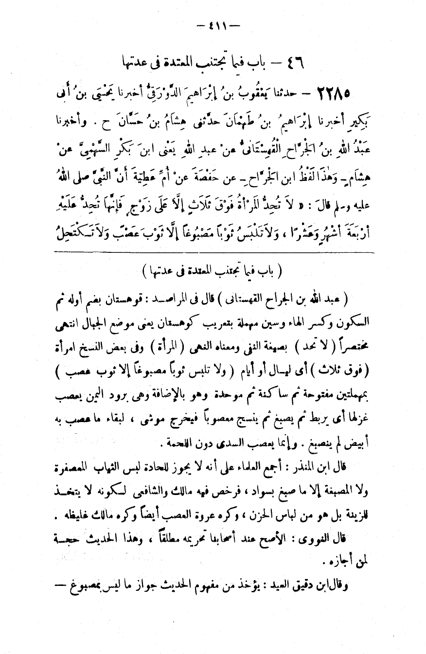 قَالَ اِبْن الْمُنْذِر : أَجْمَعَ الْعُلَمَاء عَلَى أَنَّهُ لَا يَجُوز لِلْحَادَّةِ لُبْس الثِّيَاب الْمُعَصْفَرَة وَلَا الْمُصْبَغَة إِلَّا مَا صُبِغَ بِسَوَادٍ ، فَرَخَّصَ فِيهِ مَالِك وَالشَّافِعِيّ لِكَوْنِهِ لَا يُتَّخَذ لِلزِّينَةِ بَلْ هُوَ مِنْ لِبَاس الْحُزْن ، وَكَرِهَ عُرْوَة الْعَصْب أَيْضًا وَكَرِهَ مَالِك غَلِيظه .