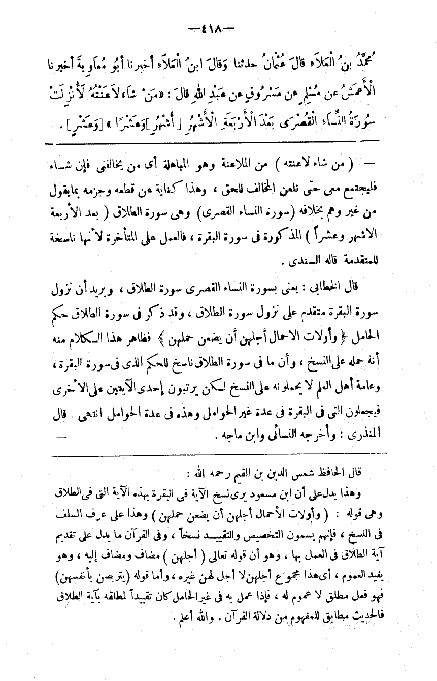قَالَ الْخَطَّابِيُّ : يَعْنِي بِسُورَةِ النِّسَاء الْقُصْرَى سُورَة الطَّلَاق ، وَيُرِيد أَنَّ نُزُول سُورَة الْبَقَرَة مُتَقَدِّم عَلَى نُزُول سُورَة الطَّلَاق ، وَقَدْ ذَكَرَ فِي سُورَة الطَّلَاق حُكْم الْحَامِل { وَأُولَاتُ الْأَحْمَال أَجَلُهُنَّ أَنْ يَضَعْنَ حَمْلَهُنَّ } فَظَاهِر هَذَا الْكَلَام مِنْهُ أَنَّهُ حَمَلَهُ عَلَى النَّسْخ ، وَأَنَّ مَا فِي سُوَرة الطَّلَاق نَاسِخ لِلْحُكْمِ الَّذِي فِي سُورَة الْبَقَرَة ، وَعَامَّة أَهْل الْعِلْم لَا يَحْمِلُونَهُ عَلَى النَّسْخ لَكِنْ يُرَتِّبُونَ إِحْدَى الْآيَتَيْنِ عَلَى الْأُخْرَى فَيَجْعَلُونَ الَّتِي فِي الْبَقَرَة فِي عِدَّة غَيْر الْحَوَامِل ، وَهَذِهِ فِي عِدَّة الْحَوَامِل اِنْتَهَى . قَالَ الْمُنْذِرِيُّ : وَأَخْرَجَهُ النَّسَائِيُّ وَابْن مَاجَهْ .@