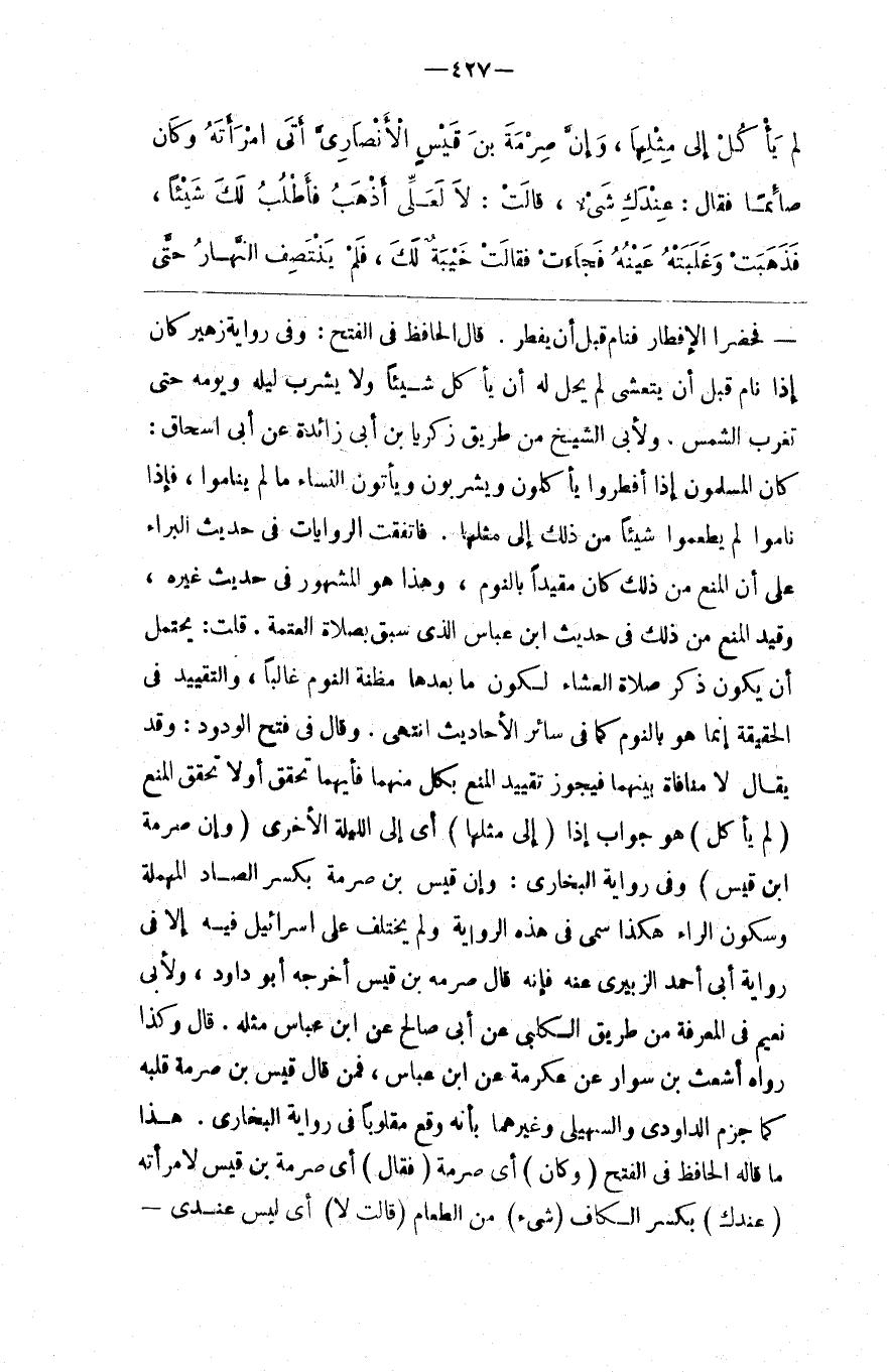 فَحَضَرَ الْإِفْطَار فَنَامَ قَبْل أَنْ يُفْطِر . قَالَ الْحَافِظ فِي الْفَتْح : وَفِي رِوَايَة زُهَيْر كَانَ إِذَا نَامَ قَبْل أَنْ يَتَعَشَّى لَمْ يَحِلّ لَهُ أَنْ يَأْكُل شَيْئًا وَلَا يَشْرَب لَيْله وَيَوْمه حَتَّى تَغْرُب الشَّمْس . وَلِأَبِي الشَّيْخ مِنْ طَرِيق زَكَرِيَّا بْن أَبِي زَائِدَة عَنْ أَبِي إِسْحَاق : كَانَ الْمُسْلِمُونَ إِذَا أَفْطَرُوا يَأْكُلُونَ وَيَشْرَبُونَ وَيَأْتُونَ النِّسَاء مَا لَمْ يَنَامُوا ، فَإِذَا نَامُوا لَمْ يَطْعَمُوا شَيْئًا مِنْ ذَلِكَ إِلَى مِثْلهَا . فَاتَّفَقَتْ الرِّوَايَات فِي حَدِيث الْبَرَاء عَلَى أَنَّ الْمَنْع مِنْ ذَلِكَ كَانَ مُقَيَّدًا بِالنَّوْمِ ، وَهَذَا هُوَ الْمَشْهُور فِي حَدِيث غَيْره ، وَقَيْد الْمَنْع مِنْ ذَلِكَ فِي حَدِيث اِبْن عَبَّاس الَّذِي سَبَقَ بِصَلَاةِ الْعَتَمَة . قُلْت . يَحْتَمِل أَنْ يَكُون ذَكَرَ صَلَاة الْعِشَاء لِكَوْنِ مَا بَعْدهَا مَظِنَّة النَّوْم غَالِبًا ، وَالتَّقْيِيد فِي الْحَقِيقَة إِنَّمَا هُوَ بِالنَّوْمِ كَمَا فِي سَائِر الْأَحَادِيث اِنْتَهَى . وَقَالَ فِي فَتْح الْوَدُود : وَقَدْ يُقَال لَا مُنَافَاة بَيْنهمَا فَيَجُوز تَقْيِيد الْمَنْع بِكُلِّ مِنْهُمَا فَأَيّهمَا تَحَقَّقَ أَوَّلًا تَحَقَّقَ الْمَنْع