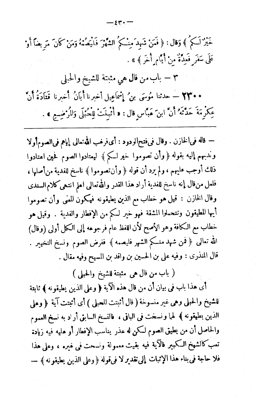 أَيْ هَذَا بَاب فِي بَيَان أَنَّ مَنْ قَالَ هَذِهِ الْآيَة ( وَعَلَى الَّذِينَ يُطِيقُونَهُ ) ثَابِتَة لِلشَّيْخِ وَالْحُبْلَى وَهِيَ غَيْر مَنْسُوخَة .