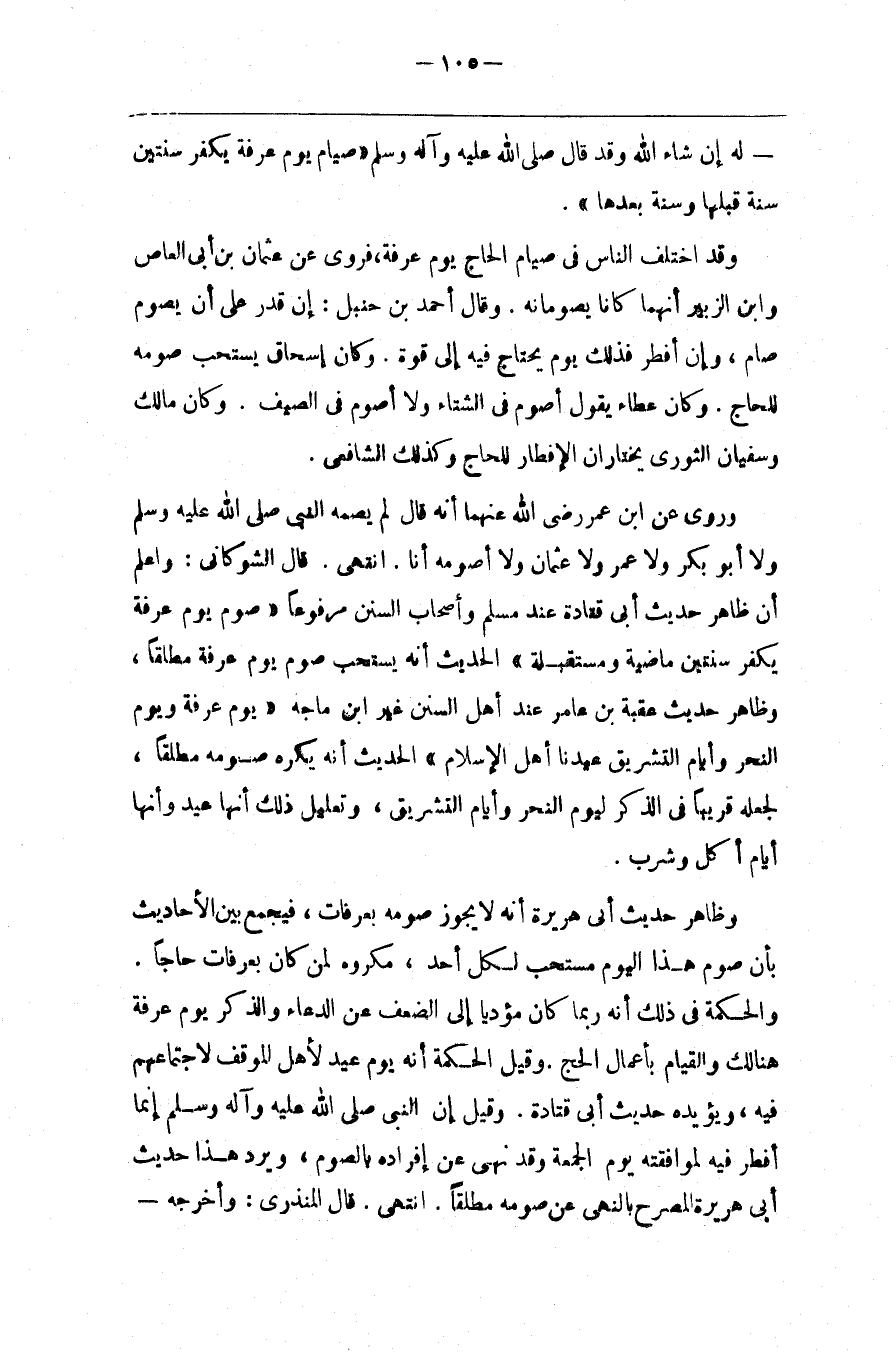 وَرُوِيَ عَنْ اِبْن عُمَر رَضِيَ اللَّه عَنْهُمَا أَنَّهُ قَالَ لَمْ يَصُمْهُ النَّبِيّ صَلَّى اللَّه عَلَيْهِ وَسَلَّمَ وَلَا أَبُو بَكْر وَلَا عُمَر وَلَا عُثْمَان وَلَا أَصُومهُ أَنَا . اِنْتَهَى . قَالَ الشَّوْكَانِيُّ : وَاعْلَمْ أَنَّ ظَاهِر حَدِيث أَبِي قَتَادَةَ عِنْد مُسْلِم وَأَصْحَاب السُّنَن مَرْفُوعًا " صَوْم يَوْم عَرَفَة يُكَفِّر سَنَتَيْنِ مَاضِيَة وَمُسْتَقْبَلَة " الْحَدِيث أَنَّهُ يُسْتَحَبّ صَوْم يَوْم عَرَفَة مُطْلَقًا ، وَظَاهِر حَدِيث عُقْبَة بْن عَامِر عِنْد أَهْل السُّنَن غَيْر اِبْن مَاجَهْ " يَوْم عَرَفَة وَيَوْم النَّحْر وَأَيَّام التَّشْرِيق عِيدنَا أَهْل الْإِسْلَام " الْحَدِيث أَنَّهُ يُكْرَه صَوْمه مُطْلَقًا ، لِجَعْلِهِ قَرِيبًا فِي الذِّكْر لِيَوْمِ النَّحْر وَأَيَّام التَّشْرِيق ، وَتَعْلِيل ذَلِكَ أَنَّهَا عِيد وَأَنَّهَا أَيَّام أَكْل وَشُرْب .