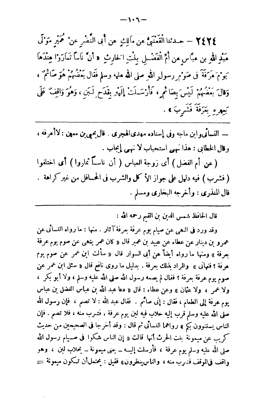 فإن الناس يستنوون بكم رواهما النسائي ثم قال وقد أخرجا في الصحيحين من حديث كريب عن ميمونة بنت الحرث أنها قالت إن الناس شكوا في صيام رسول الله صلى الله عليه و سلم يوم عرفة فأرسلت إليه يعني ميمونة بحلاب لبن وهو واقف في الموقف فشرب منه والناس ينظرون فقيل يحتمل أن تكون ميمونة