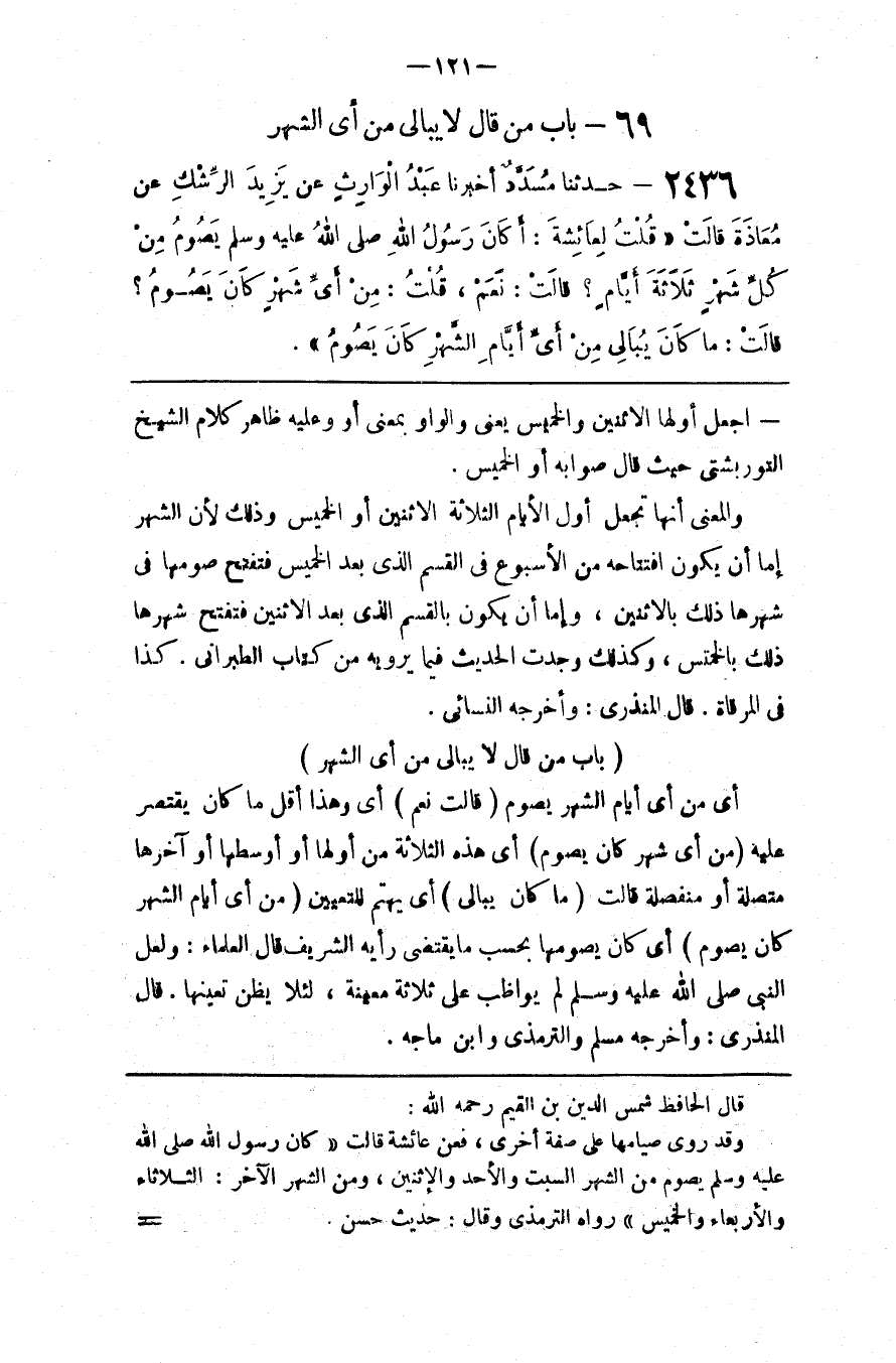 قال الحافظ شمس الدين بن القيم رحمه الله وقد روي صيامها على صفة أخرى فعن عائشة قالت كان رسول الله صلى الله عليه و سلم يصوم من الشهر