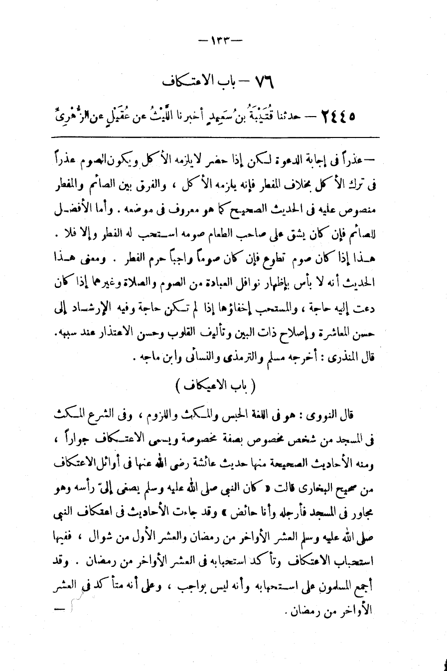 قَالَ النَّوَوِيّ : هُوَ فِي اللُّغَة الْحَبْس وَالْمُكْث وَاللُّزُوم ، وَفِي الشَّرْع الْمُكْث فِي الْمَسْجِد مِنْ شَخْص مَخْصُوص بِصِفَةٍ مَخْصُوصَة وَيُسَمَّى الِاعْتِكَاف جِوَارًا ، وَمِنْهُ الْأَحَادِيث الصَّحِيحَة مِنْهَا حَدِيث عَائِشَة رَضِيَ اللَّه عَنْهَا فِي أَوَائِل الِاعْتِكَاف فِي صَحِيح الْبُخَارِيّ قَالَتْ " كَانَ النَّبِيّ صَلَّى اللَّه عَلَيْهِ وَسَلَّمَ يُصْغِي إِلَيَّ رَأْسه وَهُوَ مُجَاوِر فِي الْمَسْجِد فَأُرَجِّلهُ وَأَنَا حَائِض " وَقَدْ جَاءَتْ الْأَحَادِيث فِي اِعْتِكَاف النَّبِيّ صَلَّى اللَّه عَلَيْهِ وَسَلَّمَ الْعَشْر الْأَوَاخِر مِنْ رَمَضَان وَالْعَشْر الْأُوَل مِنْ شَوَّال ، فَفِيهَا اِسْتِحْبَاب الِاعْتِكَاف وَتَأَكُّد اِسْتِحْبَابه فِي الْعَشْر الْأَوَاخِر مِنْ رَمَضَان . وَقَدْ أَجْمَعَ الْمُسْلِمُونَ عَلَى اِسْتِحْبَابه وَأَنَّهُ لَيْسَ بِوَاجِبٍ ، وَعَلَى أَنَّهُ مُتَأَكِّد فِي الْعَشْر الْأَوَاخِر مِنْ رَمَضَان .@
