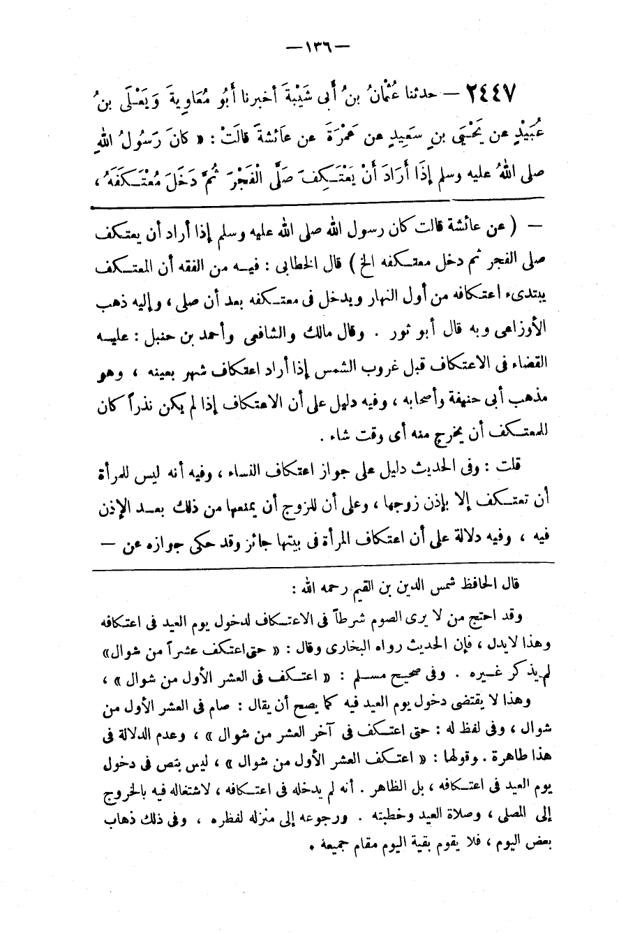قال الحافظ شمس الدين بن القيم رحمه الله وقد احتج من لا يرى الصوم شرطا في الاعتكاف لدخول يوم العيد في اعتكافه وهذا لا يدل فإن الحديث رواه البخاري وقال حتى اعتكف عشرا من شوال لم يذكر غيره