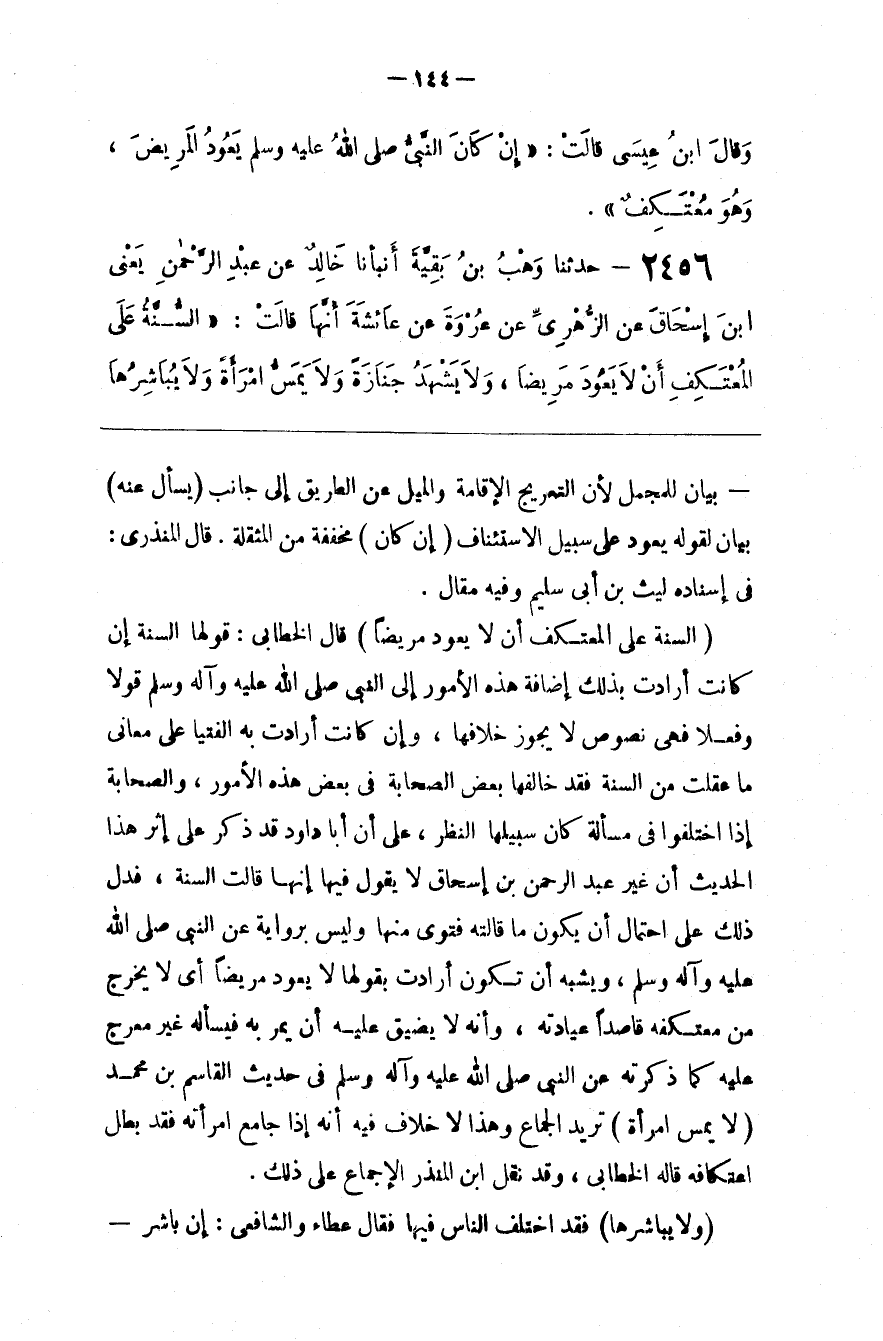 فِي بَعْض هَذِهِ الْأُمُور ، وَالصَّحَابَة إِذَا اِخْتَلَفُوا فِي مَسْأَلَة كَانَ سَبِيلهَا النَّظَر ، عَلَى أَنَّ أَبَا دَاوُدَ قَدْ ذَكَرَ عَلَى إِثْر هَذَا الْحَدِيث أَنَّ غَيْر عَبْد الرَّحْمَن بْن إِسْحَاق لَا يَقُول فِيهَا إِنَّهَا قَالَتْ السُّنَّة ، فَدَلَّ ذَلِكَ عَلَى اِحْتِمَال أَنْ يَكُون مَا قَالَتْهُ فَتْوَى مِنْهَا وَلَيْسَ بِرِوَايَةٍ عَنْ النَّبِيّ صَلَّى اللَّه عَلَيْهِ وَسَلَّمَ ، وَيُشْبِه أَنْ تَكُون أَرَادَتْ بِقَوْلِهَا لَا يَعُود مَرِيضًا أَيْ لَا يَخْرُج مِنْ مُعْتَكَفه قَاصِدًا عِيَادَته ، وَأَنَّهُ لَا يَضِيق عَلَيْهِ أَنْ يَمُرّ بِهِ فَيَسْأَلهُ غَيْر مُعَرِّج عَلَيْهِ كَمَا ذَكَرَتْهُ عَنْ النَّبِيّ صَلَّى اللَّه عَلَيْهِ وَسَلَّمَ فِي حَدِيث الْقَاسِم بْن مُحَمَّد