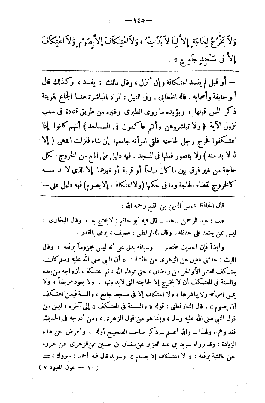 وسياقه يدل على أنه ليس مجزوما برفعه وقال الليث حدثني عقيل عن الزهري عن عائشة أن النبي صلى الله عليه و سلم كان يعتكف العشر الأواخر من رمضان حتى توفاه الله ثم اعتكف أزواجه من بعده والسنة في المعتكف أن لا يخرج إلا لحاجته التي لا بد منها ولا يعود مريضا ولا يمس امرأته ولا يباشرها ولا اعتكاف إلا في مسجد جامع والسنة فيمن اعتكف أن يصوم