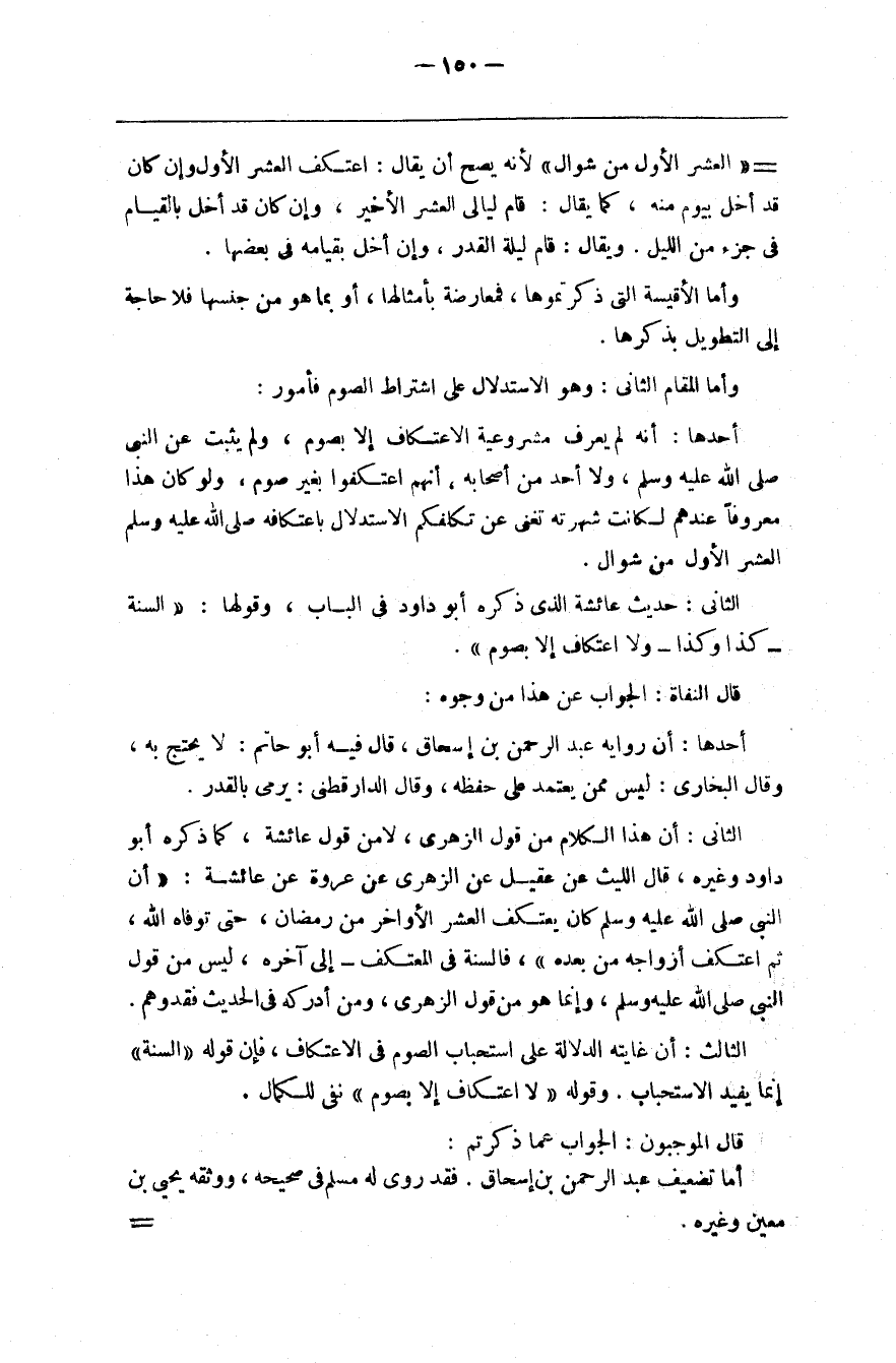 وأما المقام الثاني وهو الاستدلال على اشتراط الصوم فأمور أحدها أنه لم يعرف مشروعية الاعتكاف إلا بصوم ولم يثبت عن النبي صلى الله عليه و سلم ولا أحد من أصحابه أنهم اعتكفوا بغير صوم ولو كان هذا معروفا عندهم لكانت شهرته تغني عن تكلفكم الاستدلال باعتكافه صلى الله عليه و سلم العشر الأول من شوال