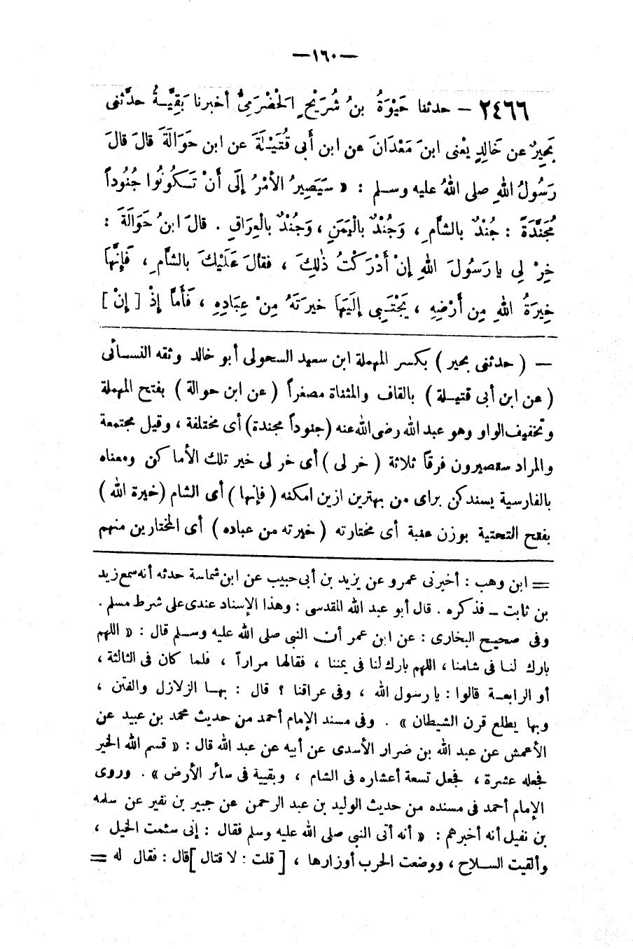 وفي صحيح البخاري عن ابن عمر أن النبي صلى الله عليه و سلم قال اللهم بارك لنا في شامنا اللهم بارك لنا في يمننا فقالها مرارا فلما كان في الثالثة أو الرابعة قالوا يارسول الله وفي عراقنا قال بها الزلازل والفتن وبها يطلع قرن الشيطان وفي مسند الإمام أحمد من حديث محمد بن عبيد عن الأعمش عن عبد الله بن ضرار الأسدى عن أبيه عن عبد الله قال قسم الله الخير فجعله عشرة فجعل تسعة أعشاره في الشام وبقيته في سائر الأرض وروى الإمام أحمد في مسنده من حديث الوليد بن عبدالرحمن عن جبير بن نفير عن سلمة بن نفيل أنه أخبرهم أنه أتى النبي صلى الله عليه و سلم فقال إني سئمت الخيل وألقيت السلاح ووضعت الحرب أوزارها قلت لا قتال قال فقال له