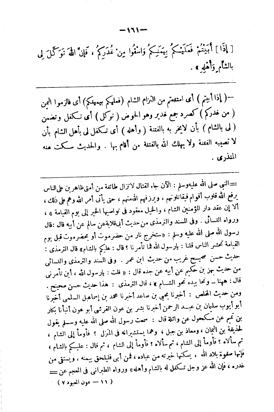 النبي صلى الله عليه و سلم الآن جاء القتال لا تزال طائفة من أمتي ظاهرين على الناس يرفع الله قلوب أقوام فيقاتلونهم ويرزقهم الله منهم حتى يأتي أمر الله وهم على ذلك ألا إن عقد دار المؤمنين الشام والخيل معقود في نواصيها الخير إلى يوم القيامة ورواه النسائي وفي المسند والترمذي من حديث أبي قلابة عن سالم عن أبيه قال قال رسول الله صلى الله عليه و سلم ستخرج نار من حضرموت أو بحضرموت قبل يوم القيامة تحشر الناس قلنا يارسول الله فما تأمرنا قال عليكم بالشام قال الترمذي حديث حسن صحيح غريب من حديث ابن عمر