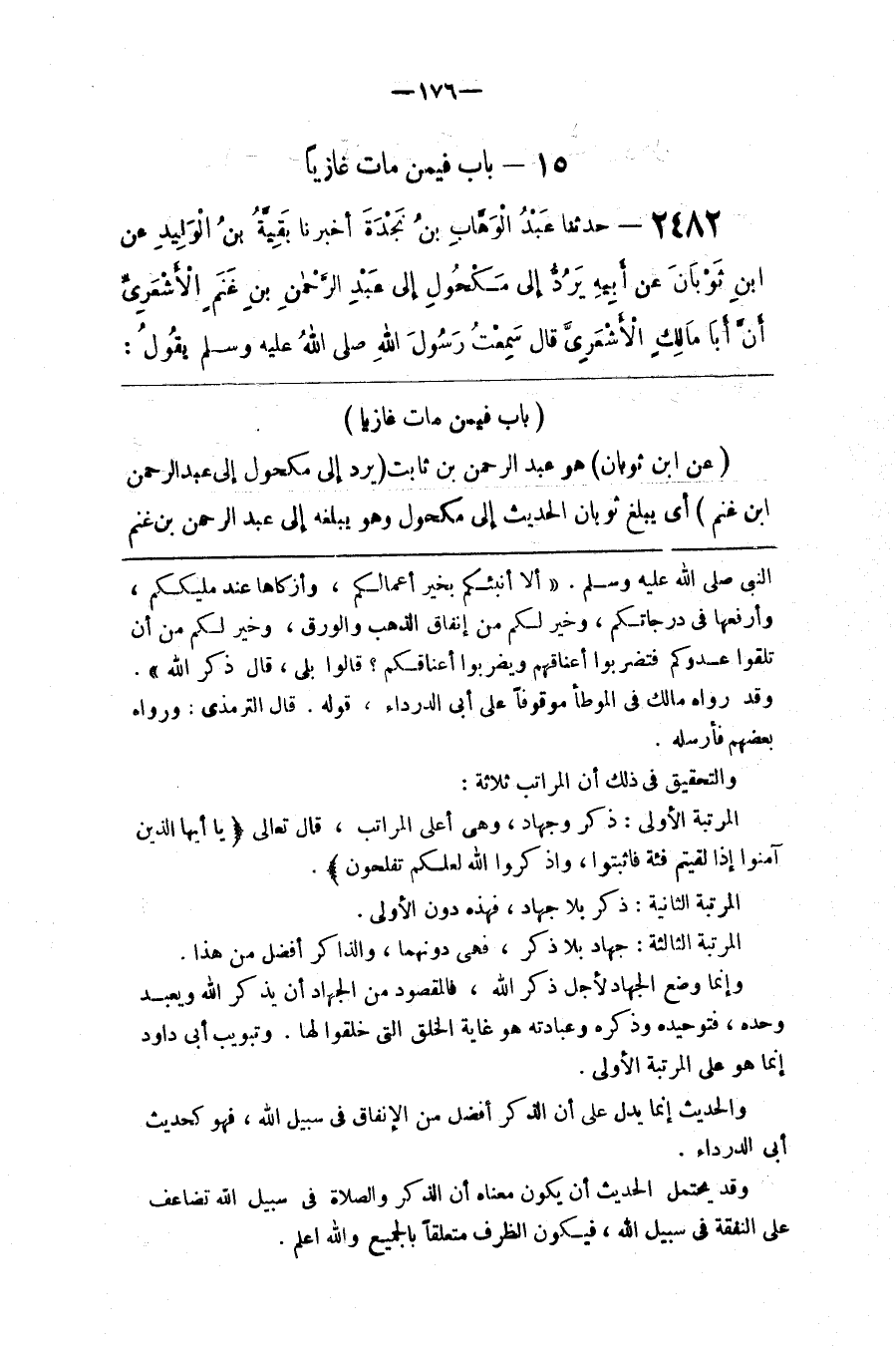 والتحقيق في ذلك أن المراتب ثلاثة المرتبة الأولى ذكر وجهاد وهي أعلى المراتب قال تعالى ياأيها الذين آمنوا إذا لقيتم فئة فاثبتوا واذكروا الله لعلكم تفلحون