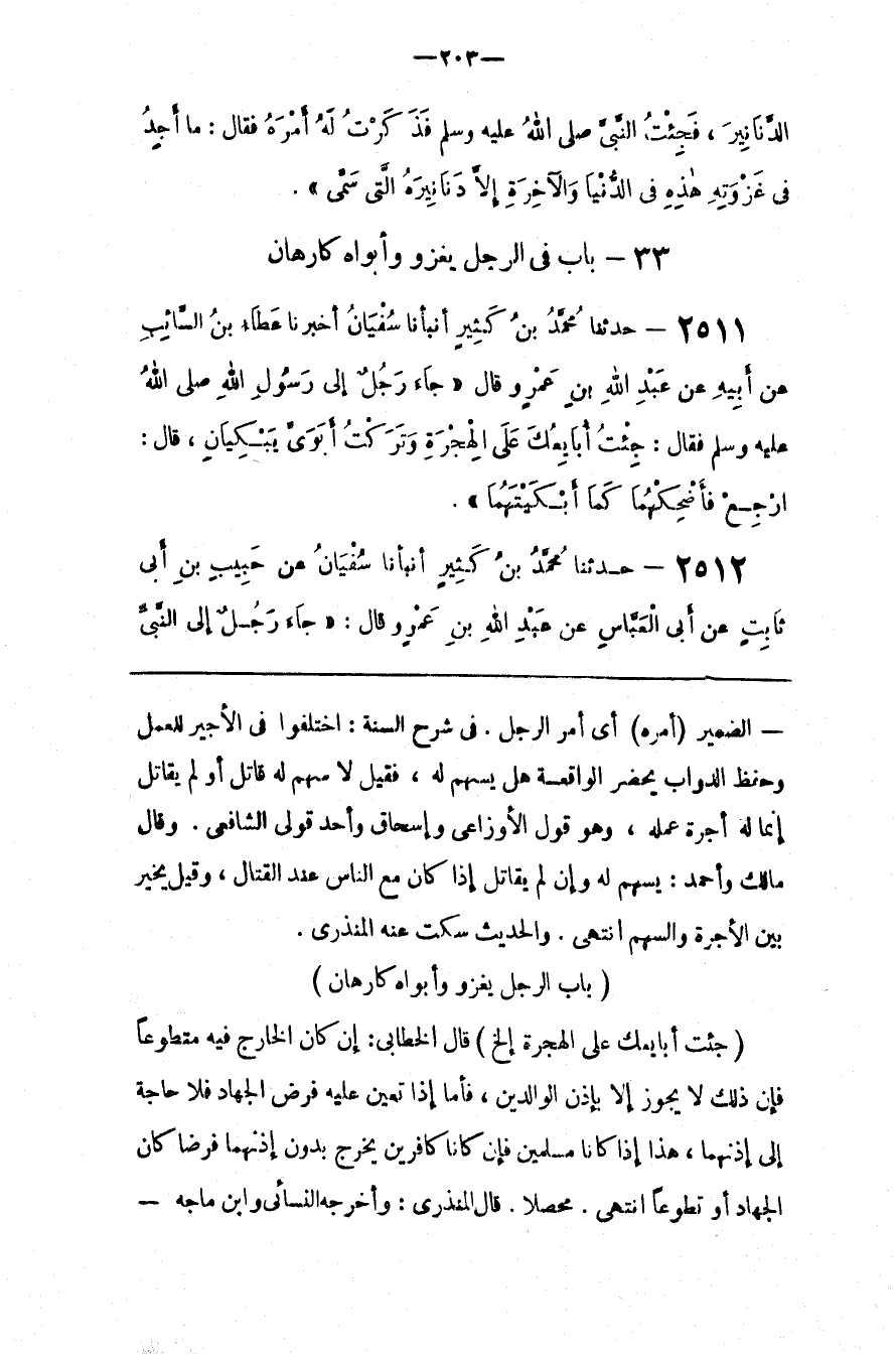 : قَالَ الْخَطَّابِيُّ : إِنْ كَانَ الْخَارِج فِيهِ مُتَطَوِّعًا فَإِنَّ ذَلِكَ لَا يَجُوز إِلَّا بِإِذْنِ الْوَالِدَيْنِ ، فَأَمَّا إِذَا تَعَيَّنَ عَلَيْهِ فَرْض الْجِهَاد فَلَا حَاجَة إِلَى إِذْنهمَا ، هَذَا إِذَا كَانَا مُسْلِمَيْنِ فَإِنْ كَانَا كَافِرَيْنِ يَخْرُج بِدُونِ إِذْنهمَا فَرْضًا كَانَ الْجِهَاد أَوْ تَطَوُّعًا اِنْتَهَى مُحَصَّلًا .