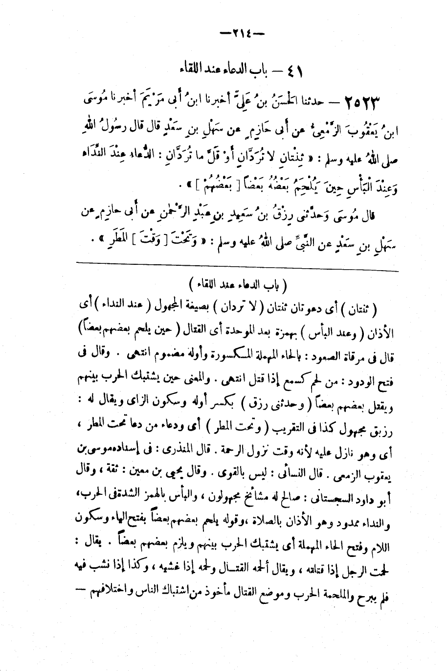 : أَيْ وَدُعَاء مَنْ دَعَا تَحْت الْمَطَر ، أَيْ وَهُوَ نَازِل عَلَيْهِ لِأَنَّهُ وَقْت نُزُول الرَّحْمَة . قَالَ الْمُنْذِرِيُّ : فِي إِسْنَاده مُوسَى بْن يَعْقُوب الزَّمْعِيّ . قَالَ النَّسَائِيُّ : لَيْسَ بِالْقَوِيِّ . وَقَالَ يَحْيَى بْن مَعِين : ثِقَة ، وَقَالَ أَبُو دَاوُدَ السَّجِسْتَانِيّ : صَالِح لَهُ مَشَايِخ مَجْهُولُونَ ، وَالْبَأْس بِالْهَمْزِ الشِّدَّة فِي الْحَرْب ، وَالنِّدَاء مَمْدُود وَهُوَ الْأَذَان بِالصَّلَاةِ ، وَقَوْله يَلْحَم بَعْضهمْ بَعْضًا بِفَتْحِ الْيَاء وَسُكُون اللَّام وَفَتْح الْحَاء الْمُهْمَلَة أَيْ يَشْتَبِك الْحَرْب بَيْنهمْ وَيَلْزَم بَعْضهمْ بَعْضًا . يُقَال : لَحَمْت الرَّجُل إِذَا قَتَلْته ، وَيُقَال أَلْحَمَهُ الْقِتَال وَلَحَمَهُ إِذَا غَشِيَهُ ، وَكَذَا إِذَا نَشِبَ فِيهِ فَلَمْ يَبْرَح وَالْمَلْحَمَة الْحَرْب وَمَوْضِع الْقِتَال مَأْخُوذ مِنْ اِشْتِبَاك النَّاس وَاخْتِلَافهمْ@