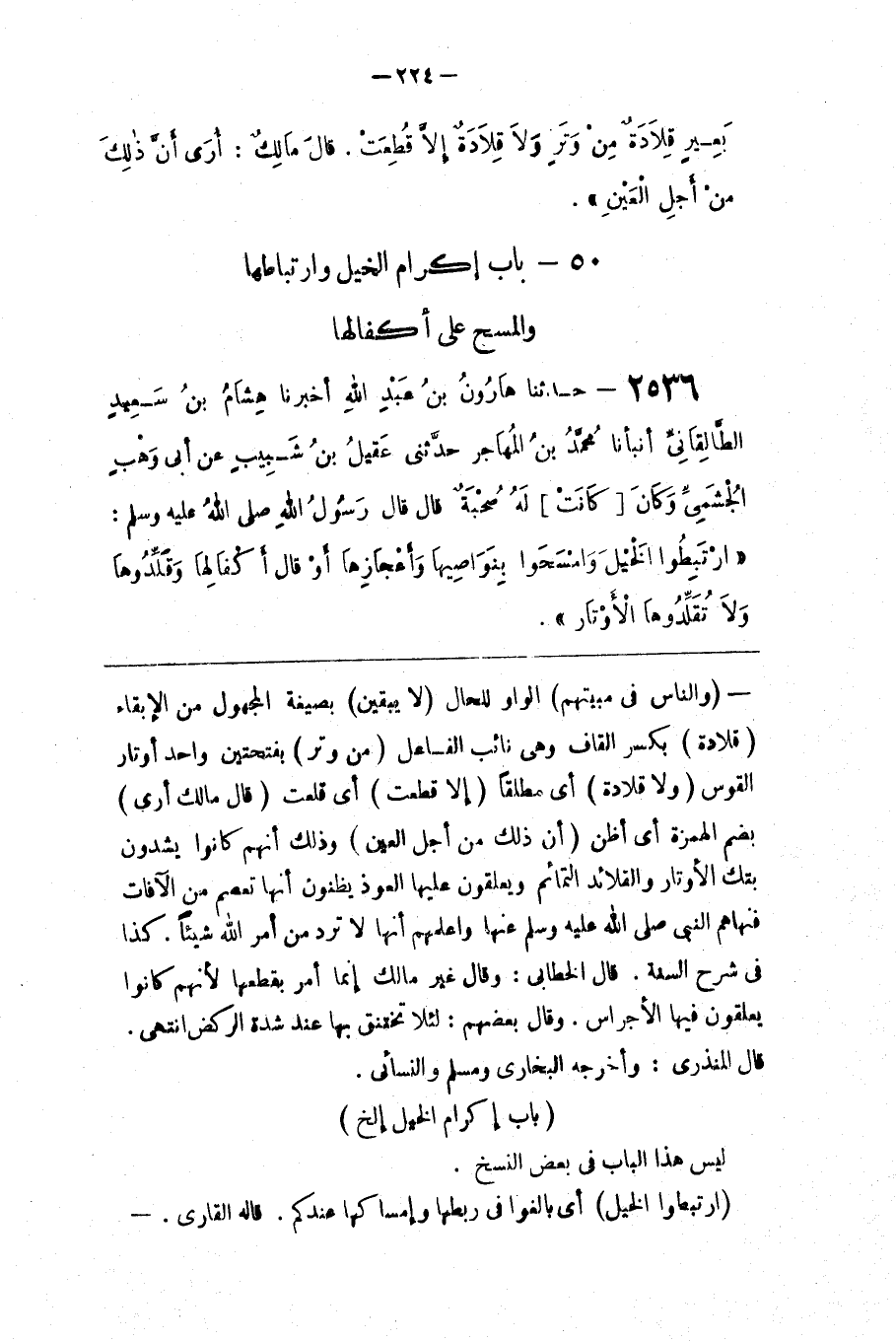 : وَذَلِكَ أَنَّهُمْ كَانُوا يَشُدُّونَ بِتِلْكَ الْأَوْتَار وَالْقَلَائِد التَّمَائِم وَيُعَلِّقُونَ عَلَيْهَا الْعِوَذ يَظُنُّونَ أَنَّهَا تَعْصِم مِنْ الْآفَات فَنَهَاهُمْ النَّبِيّ صَلَّى اللَّه عَلَيْهِ وَسَلَّمَ عَنْهَا وَأَعْلَمَهُمْ أَنَّهَا لَا تَرُدّ مِنْ أَمْر اللَّه شَيْئًا . كَذَا فِي شَرْح السُّنَّة . قَالَ الْخَطَّابِيُّ : وَقَالَ غَيْر مَالِك إِنَّمَا أَمَرَ بِقَطْعِهَا لِأَنَّهُمْ كَانُوا يُعَلِّقُونَ فِيهَا الْأَجْرَاس . وَقَالَ بَعْضهمْ : لِئَلَّا تَخْتَنِق بِهَا عِنْد شِدَّة الرَّكْض اِنْتَهَى .