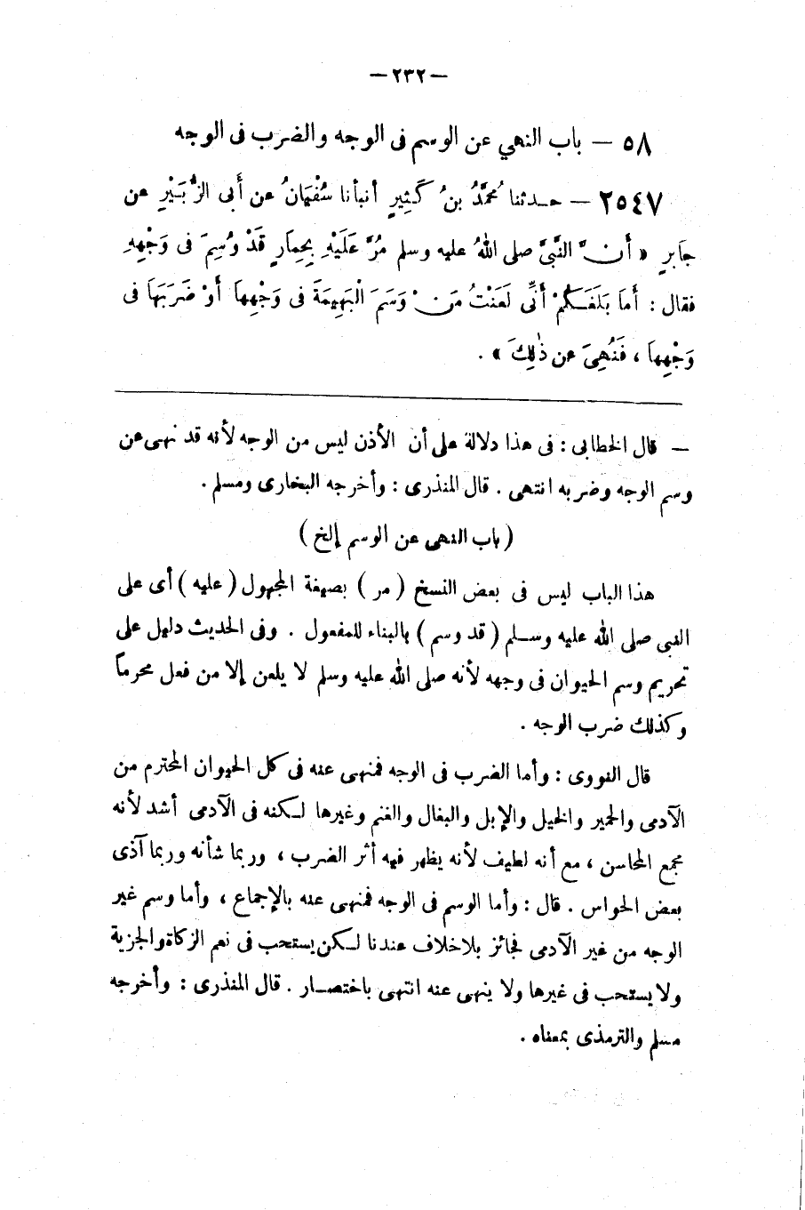 قَالَ الْخَطَّابِيُّ : فِي هَذَا دَلَالَة عَلَى أَنَّ الْأُذُن لَيْسَ مِنْ الْوَجْه لِأَنَّهُ قَدْ نَهَى عَنْ وَسْم الْوَجْه وَضَرْبه اِنْتَهَى . قَالَ الْمُنْذِرِيُّ : وَأَخْرَجَهُ الْبُخَارِيّ وَمُسْلِم .